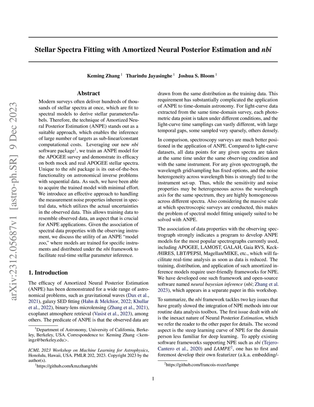 Modern surveys often deliver hundreds of thousands of stellar spectra at once, which are fit to spectral models to derive stellar parameters/labels. Therefore, the technique of Amortized Neural Posterior Estimation (ANPE) stands out as a suitable approach, which enables the inference of large number of targets as sub-linear/constant computational costs. Leveraging our new nbi software package, we train an ANPE model for the APOGEE survey and demonstrate its efficacy on both mock and real APOGEE stellar spectra. Unique to the nbi package is its out-of-the-box functionality on astronomical inverse problems with sequential data. As such, we have been able to acquire the trained model with minimal effort. We introduce an effective approach to handling the measurement noise properties inherent in spectral data, which utilizes the actual uncertainties in the observed data. This allows training data to resemble observed data, an aspect that is crucial for ANPE applications. Given the association of spectral data properties with the observing instrument, we discuss the utility of an ANPE "model zoo," where models are trained for specific instruments and distributed under the nbi framework to facilitate real-time stellar parameter inference.