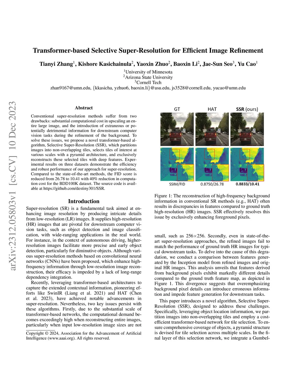 Conventional super-resolution methods suffer from two drawbacks: substantial computational cost in upscaling an entire large image, and the introduction of extraneous or potentially detrimental information for downstream computer vision tasks during the refinement of the background. To solve these issues, we propose a novel transformer-based algorithm, Selective Super-Resolution (SSR), which partitions images into non-overlapping tiles, selects tiles of interest at various scales with a pyramid architecture, and exclusively reconstructs these selected tiles with deep features. Experimental results on three datasets demonstrate the efficiency and robust performance of our approach for super-resolution. Compared to the state-of-the-art methods, the FID score is reduced from 26.78 to 10.41 with 40% reduction in computation cost for the BDD100K dataset. The source code is available at https://github.com/destiny301/SSR.