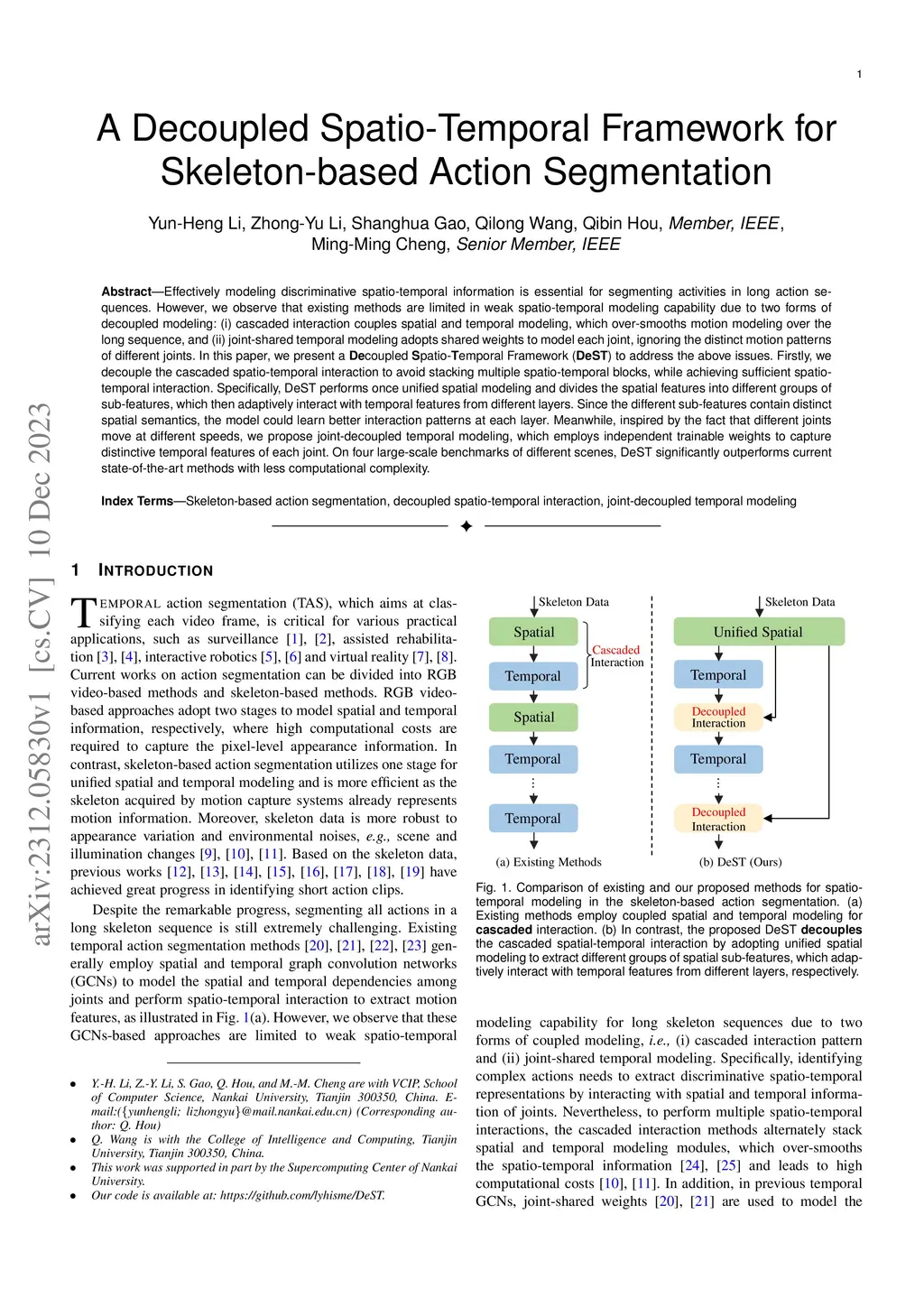 Effectively modeling discriminative spatio-temporal information is essential for segmenting activities in long action sequences. However, we observe that existing methods are limited in weak spatio-temporal modeling capability due to two forms of decoupled modeling: (i) cascaded interaction couples spatial and temporal modeling, which over-smooths motion modeling over the long sequence, and (ii) joint-shared temporal modeling adopts shared weights to model each joint, ignoring the distinct motion patterns of different joints. We propose a Decoupled Spatio-Temporal Framework (DeST) to address the above issues. Firstly, we decouple the cascaded spatio-temporal interaction to avoid stacking multiple spatio-temporal blocks, while achieving sufficient spatio-temporal interaction. Specifically, DeST performs once unified spatial modeling and divides the spatial features into different groups of subfeatures, which then adaptively interact with temporal features from different layers. Since the different sub-features contain distinct spatial semantics, the model could learn the optimal interaction pattern at each layer. Meanwhile, inspired by the fact that different joints move at different speeds, we propose joint-decoupled temporal modeling, which employs independent trainable weights to capture distinctive temporal features of each joint. On four large-scale benchmarks of different scenes, DeST significantly outperforms current state-of-the-art methods with less computational complexity.