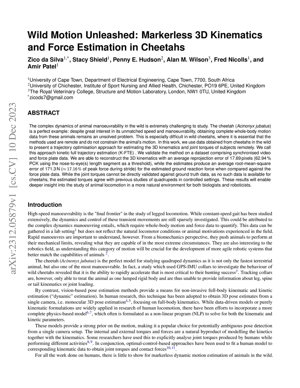 The complex dynamics of animal manoeuvrability in the wild is extremely challenging to study. The cheetah () is a perfect example: despite great interest in its unmatched speed and manoeuvrability, obtaining complete whole-body motion data from these animals remains an unsolved problem. This is especially difficult in wild cheetahs, where it is essential that the methods used are remote and do not constrain the animal's motion. In this work, we use data obtained from cheetahs in the wild to present a trajectory optimisation approach for estimating the 3D kinematics and joint torques of subjects remotely. We call this approach kinetic full trajectory estimation (K-FTE). We validate the method on a dataset comprising synchronised video and force plate data. We are able to reconstruct the 3D kinematics with an average reprojection error of 17.69 pixels (62.94 PCK using the nose-to-eye(s) length segment as a threshold), while the estimates produce an average root-mean-square error of 171.3 N ( 17.16 of peak force during stride) for the estimated ground reaction force when compared against the force plate data. While the joint torques cannot be directly validated against ground truth data, as no such data is available for cheetahs, the estimated torques agree with previous studies of quadrupeds in controlled settings. These results will enable deeper insight into the study of animal locomotion in a more natural environment for both biologists and roboticists.