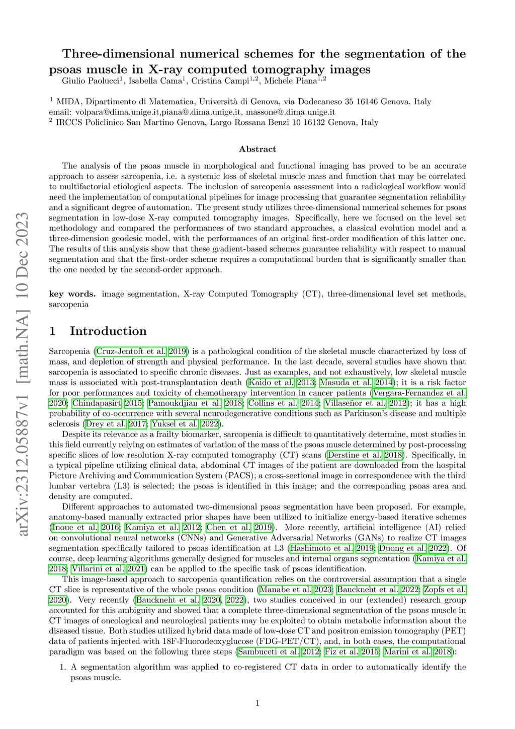 The analysis of the psoas muscle in morphological and functional imaging has proved to be an accurate approach to assess sarcopenia, i.e. a systemic loss of skeletal muscle mass and function that may be correlated to multifactorial etiological aspects. The inclusion of sarcopenia assessment into a radiological workflow would need the implementation of computational pipelines for image processing that guarantee segmentation reliability and a significant degree of automation. The present study utilizes three-dimensional numerical schemes for psoas segmentation in low-dose X-ray computed tomography images. Specifically, here we focused on the level set methodology and compared the performances of two standard approaches, a classical evolution model and a three-dimension geodesic model, with the performances of an original first-order modification of this latter one. The results of this analysis show that these gradient-based schemes guarantee reliability with respect to manual segmentation and that the first-order scheme requires a computational burden that is significantly smaller than the one needed by the second-order approach.