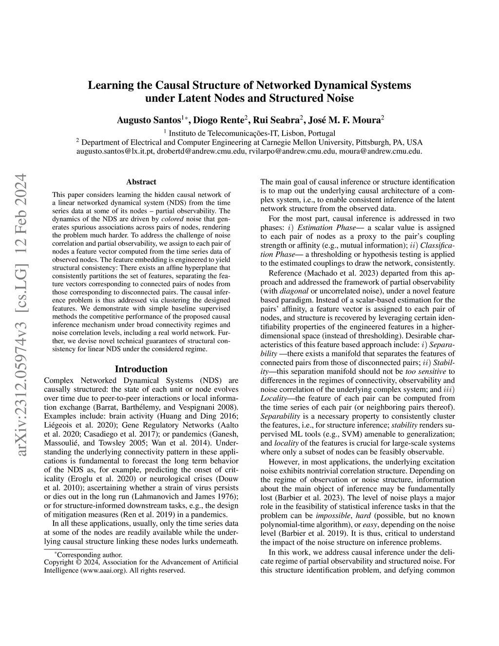 This paper considers learning the hidden causal network of a linear networked dynamical system (NDS) from the time series data at some of its nodes -- partial observability. The dynamics of the NDS are driven by colored noise that generates spurious associations across pairs of nodes, rendering the problem much harder. To address the challenge of noise correlation and partial observability, we assign to each pair of nodes a feature vector computed from the time series data of observed nodes. The feature embedding is engineered to yield structural consistency: there exists an affine hyperplane that consistently partitions the set of features, separating the feature vectors corresponding to connected pairs of nodes from those corresponding to disconnected pairs. The causal inference problem is thus addressed via clustering the designed features. We demonstrate with simple baseline supervised methods the competitive performance of the proposed causal inference mechanism under broad connectivity regimes and noise correlation levels, including a real world network. Further, we devise novel technical guarantees of structural consistency for linear NDS under the considered regime.