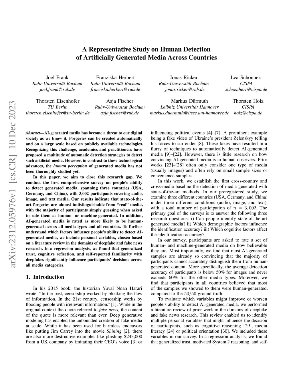 AI-generated media has become a threat to our digital society as we know it. These forgeries can be created automatically and on a large scale based on publicly available technology. Recognizing this challenge, academics and practitioners have proposed a multitude of automatic detection strategies to detect such artificial media. However, in contrast to these technical advances, the human perception of generated media has not been thoroughly studied yet. In this paper, we aim at closing this research gap. We perform the first comprehensive survey into people's ability to detect generated media, spanning three countries (USA, Germany, and China) with 3,002 participants across audio, image, and text media. Our results indicate that state-of-the-art forgeries are almost indistinguishable from "real" media, with the majority of participants simply guessing when asked to rate them as human- or machine-generated. In addition, AI-generated media receive is voted more human like across all media types and all countries. To further understand which factors influence people's ability to detect generated media, we include personal variables, chosen based on a literature review in the domains of deepfake and fake news research. In a regression analysis, we found that generalized trust, cognitive reflection, and self-reported familiarity with deepfakes significantly influence participant's decision across all media categories.