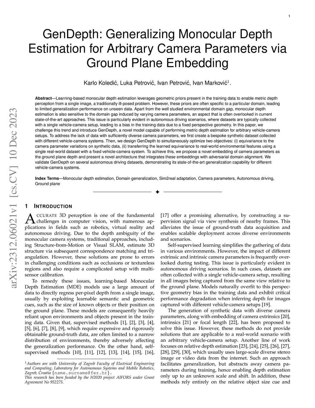 Learning-based monocular depth estimation leverages geometric priors present in the training data to enable metric depth perception from a single image, a traditionally ill-posed problem. However, these priors are often specific to a particular domain, leading to limited generalization performance on unseen data. Apart from the well studied environmental domain gap, monocular depth estimation is also sensitive to the domain gap induced by varying camera parameters, an aspect that is often overlooked in current state-of-the-art approaches. This issue is particularly evident in autonomous driving scenarios, where datasets are typically collected with a single vehicle-camera setup, leading to a bias in the training data due to a fixed perspective geometry. In this paper, we challenge this trend and introduce GenDepth, a novel model capable of performing metric depth estimation for arbitrary vehicle-camera setups. To address the lack of data with sufficiently diverse camera parameters, we first create a bespoke synthetic dataset collected with different vehicle-camera systems. Then, we design GenDepth to simultaneously optimize two objectives: (i) equivariance to the camera parameter variations on synthetic data, (ii) transferring the learned equivariance to real-world environmental features using a single real-world dataset with a fixed vehicle-camera system. To achieve this, we propose a novel embedding of camera parameters as the ground plane depth and present a novel architecture that integrates these embeddings with adversarial domain alignment. We validate GenDepth on several autonomous driving datasets, demonstrating its state-of-the-art generalization capability for different vehicle-camera systems.