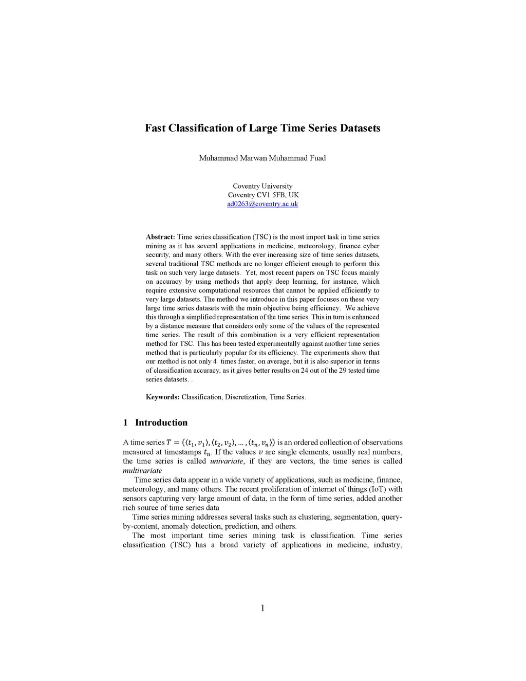 Time series classification (TSC) is the most import task in time series mining as it has several applications in medicine, meteorology, finance cyber security, and many others. With the ever increasing size of time series datasets, several traditional TSC methods are no longer efficient enough to perform this task on such very large datasets. Yet, most recent papers on TSC focus mainly on accuracy by using methods that apply deep learning, for instance, which require extensive computational resources that cannot be applied efficiently to very large datasets. The method we introduce in this paper focuses on these very large time series datasets with the main objective being efficiency. We achieve this through a simplified representation of the time series. This in turn is enhanced by a distance measure that considers only some of the values of the represented time series. The result of this combination is a very efficient representation method for TSC. This has been tested experimentally against another time series method that is particularly popular for its efficiency. The experiments show that our method is not only 4 times faster, on average, but it is also superior in terms of classification accuracy, as it gives better results on 24 out of the 29 tested time series datasets. .
