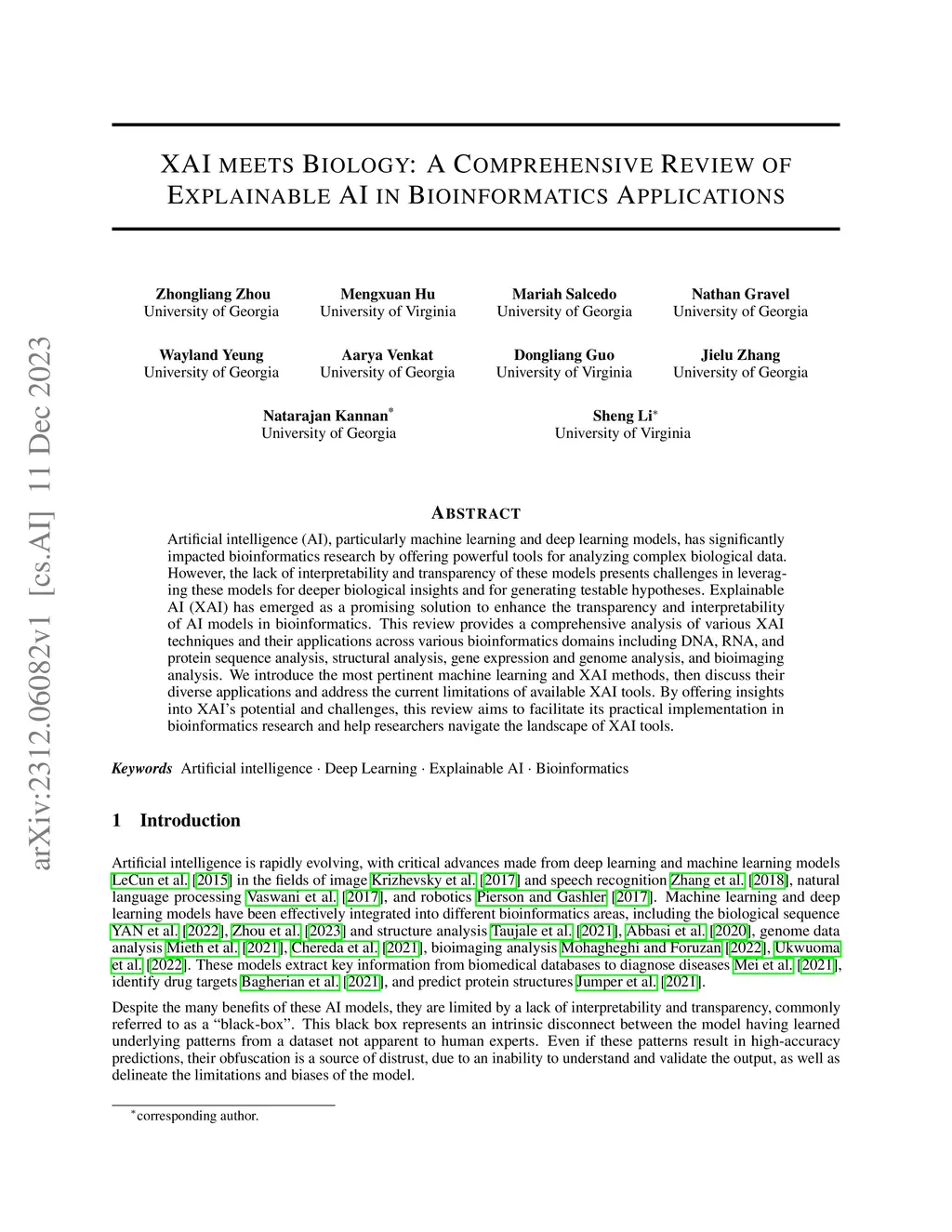 Artificial intelligence (AI), particularly machine learning and deep learning models, has significantly impacted bioinformatics research by offering powerful tools for analyzing complex biological data. However, the lack of interpretability and transparency of these models presents challenges in leveraging these models for deeper biological insights and for generating testable hypotheses. Explainable AI (XAI) has emerged as a promising solution to enhance the transparency and interpretability of AI models in bioinformatics. This review provides a comprehensive analysis of various XAI techniques and their applications across various bioinformatics domains including DNA, RNA, and protein sequence analysis, structural analysis, gene expression and genome analysis, and bioimaging analysis. We introduce the most pertinent machine learning and XAI methods, then discuss their diverse applications and address the current limitations of available XAI tools. By offering insights into XAI's potential and challenges, this review aims to facilitate its practical implementation in bioinformatics research and help researchers navigate the landscape of XAI tools.