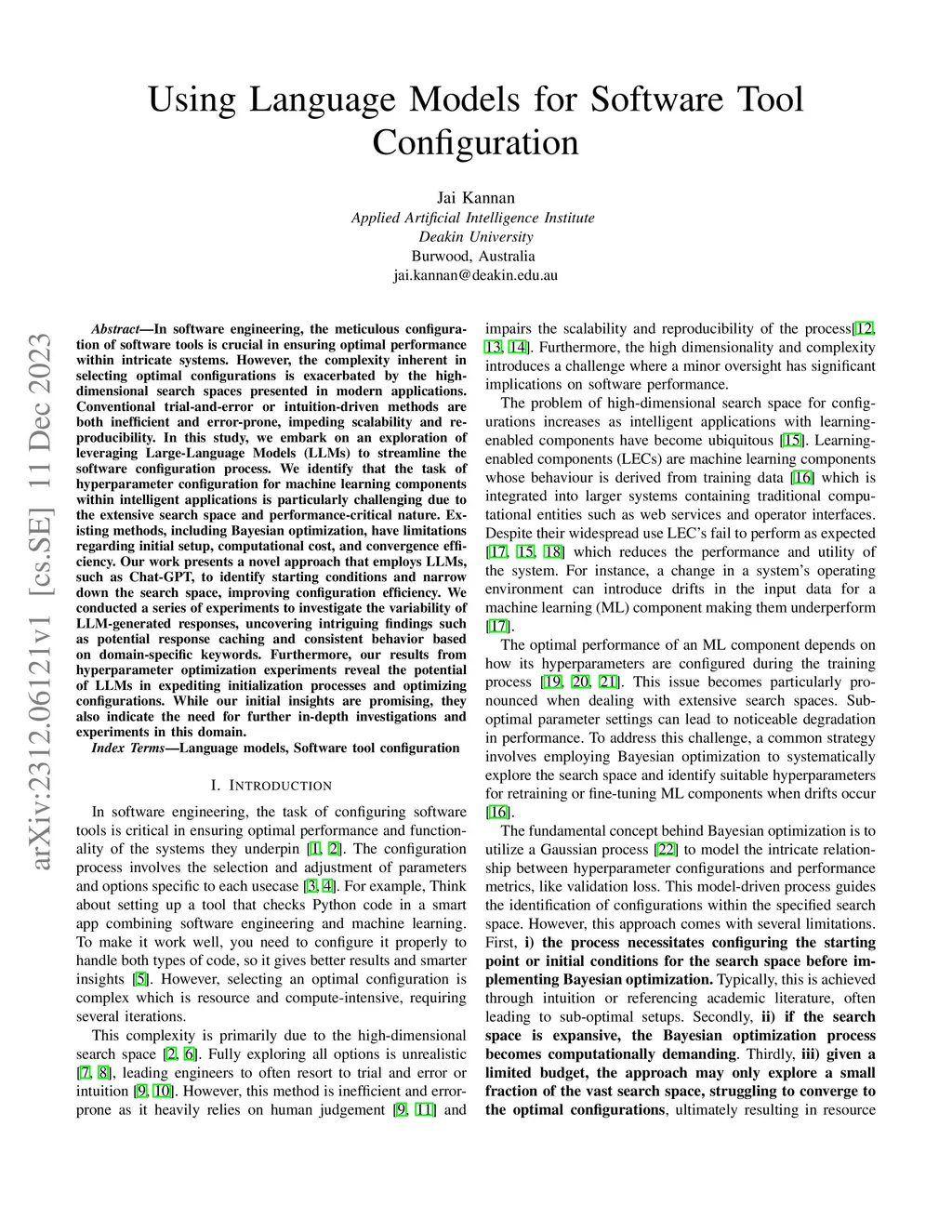 In software engineering, the meticulous configuration of software tools is crucial in ensuring optimal performance within intricate systems. However, the complexity inherent in selecting optimal configurations is exacerbated by the high-dimensional search spaces presented in modern applications. Conventional trial-and-error or intuition-driven methods are both inefficient and error-prone, impeding scalability and reproducibility. In this study, we embark on an exploration of leveraging Large-Language Models (LLMs) to streamline the software configuration process. We identify that the task of hyperparameter configuration for machine learning components within intelligent applications is particularly challenging due to the extensive search space and performance-critical nature. Existing methods, including Bayesian optimization, have limitations regarding initial setup, computational cost, and convergence efficiency. Our work presents a novel approach that employs LLMs, such as Chat-GPT, to identify starting conditions and narrow down the search space, improving configuration efficiency. We conducted a series of experiments to investigate the variability of LLM-generated responses, uncovering intriguing findings such as potential response caching and consistent behavior based on domain-specific keywords. Furthermore, our results from hyperparameter optimization experiments reveal the potential of LLMs in expediting initialization processes and optimizing configurations. While our initial insights are promising, they also indicate the need for further in-depth investigations and experiments in this domain.