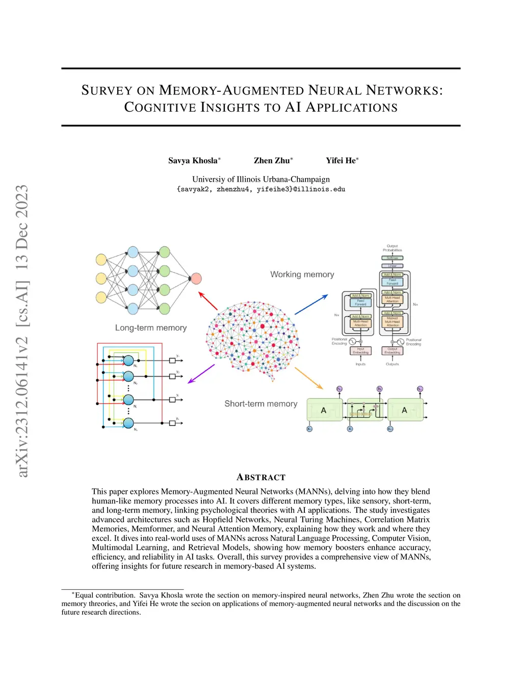 This paper explores Memory-Augmented Neural Networks (MANNs), delving into how they blend human-like memory processes into AI. It covers different memory types, like sensory, short-term, and long-term memory, linking psychological theories with AI applications. The study investigates advanced architectures such as Hopfield Networks, Neural Turing Machines, Correlation Matrix Memories, Memformer, and Neural Attention Memory, explaining how they work and where they excel. It dives into real-world uses of MANNs across Natural Language Processing, Computer Vision, Multimodal Learning, and Retrieval Models, showing how memory boosters enhance accuracy, efficiency, and reliability in AI tasks. Overall, this survey provides a comprehensive view of MANNs, offering insights for future research in memory-based AI systems.