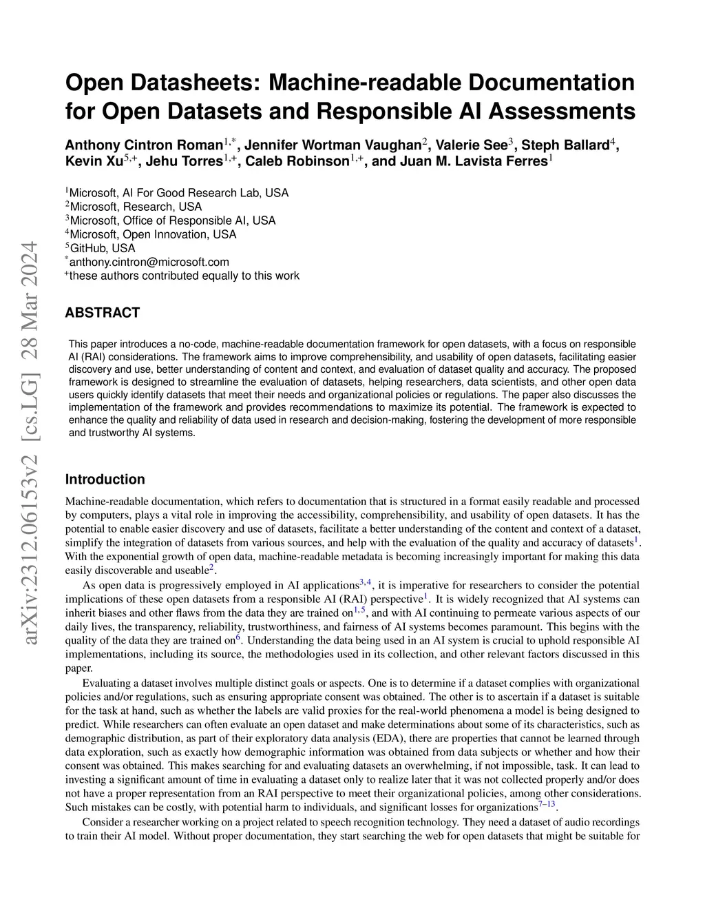 This paper introduces a no-code, machine-readable documentation framework for open datasets, with a focus on responsible AI (RAI) considerations. The framework aims to improve comprehensibility, and usability of open datasets, facilitating easier discovery and use, better understanding of content and context, and evaluation of dataset quality and accuracy. The proposed framework is designed to streamline the evaluation of datasets, helping researchers, data scientists, and other open data users quickly identify datasets that meet their needs and organizational policies or regulations. The paper also discusses the implementation of the framework and provides recommendations to maximize its potential. The framework is expected to enhance the quality and reliability of data used in research and decision-making, fostering the development of more responsible and trustworthy AI systems.