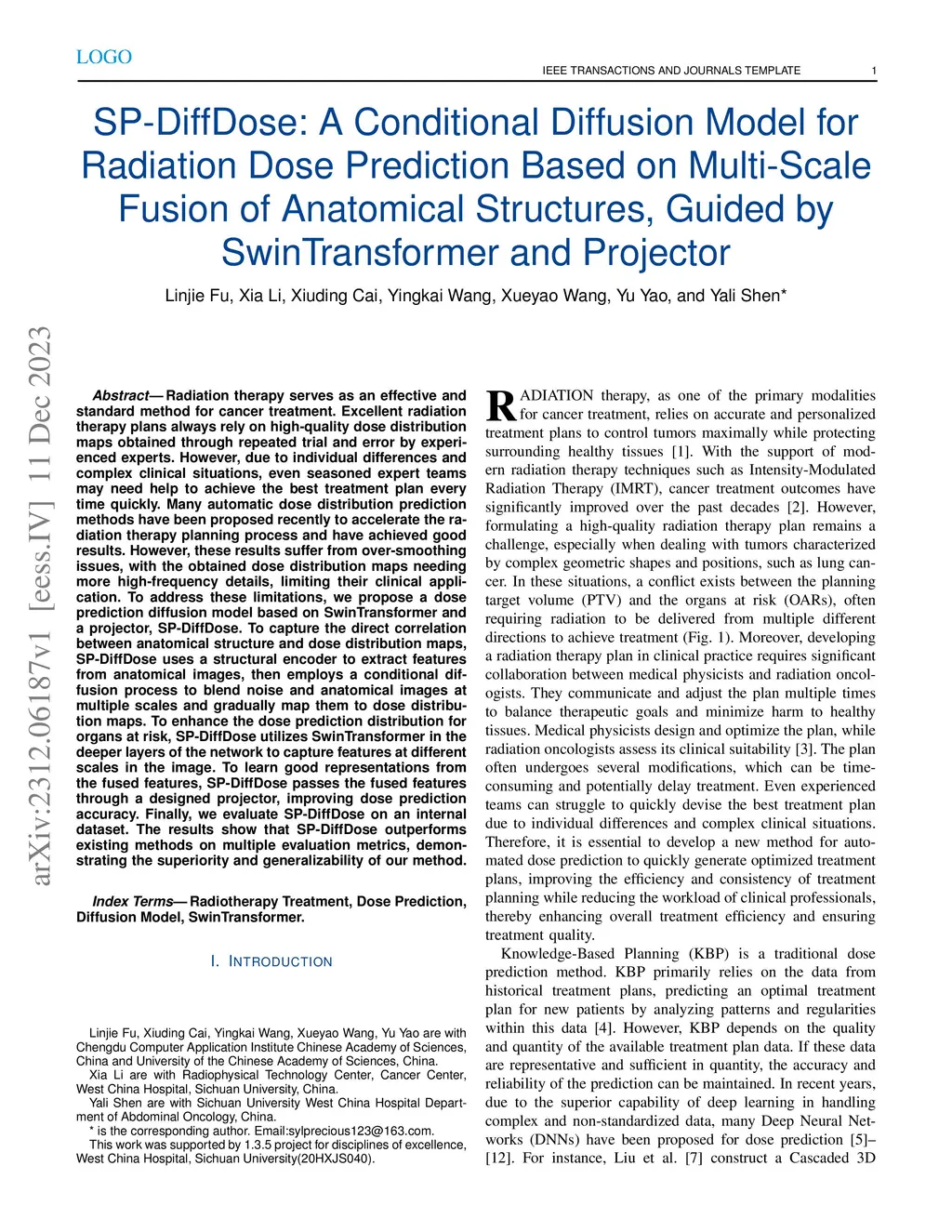 Radiation therapy serves as an effective and standard method for cancer treatment. Excellent radiation therapy plans always rely on high-quality dose distribution maps obtained through repeated trial and error by experienced experts. However, due to individual differences and complex clinical situations, even seasoned expert teams may need help to achieve the best treatment plan every time quickly. Many automatic dose distribution prediction methods have been proposed recently to accelerate the radiation therapy planning process and have achieved good results. However, these results suffer from over-smoothing issues, with the obtained dose distribution maps needing more high-frequency details, limiting their clinical application. To address these limitations, we propose a dose prediction diffusion model based on SwinTransformer and a projector, SP-DiffDose. To capture the direct correlation between anatomical structure and dose distribution maps, SP-DiffDose uses a structural encoder to extract features from anatomical images, then employs a conditional diffusion process to blend noise and anatomical images at multiple scales and gradually map them to dose distribution maps. To enhance the dose prediction distribution for organs at risk, SP-DiffDose utilizes SwinTransformer in the deeper layers of the network to capture features at different scales in the image. To learn good representations from the fused features, SP-DiffDose passes the fused features through a designed projector, improving dose prediction accuracy. Finally, we evaluate SP-DiffDose on an internal dataset. The results show that SP-DiffDose outperforms existing methods on multiple evaluation metrics, demonstrating the superiority and generalizability of our method.