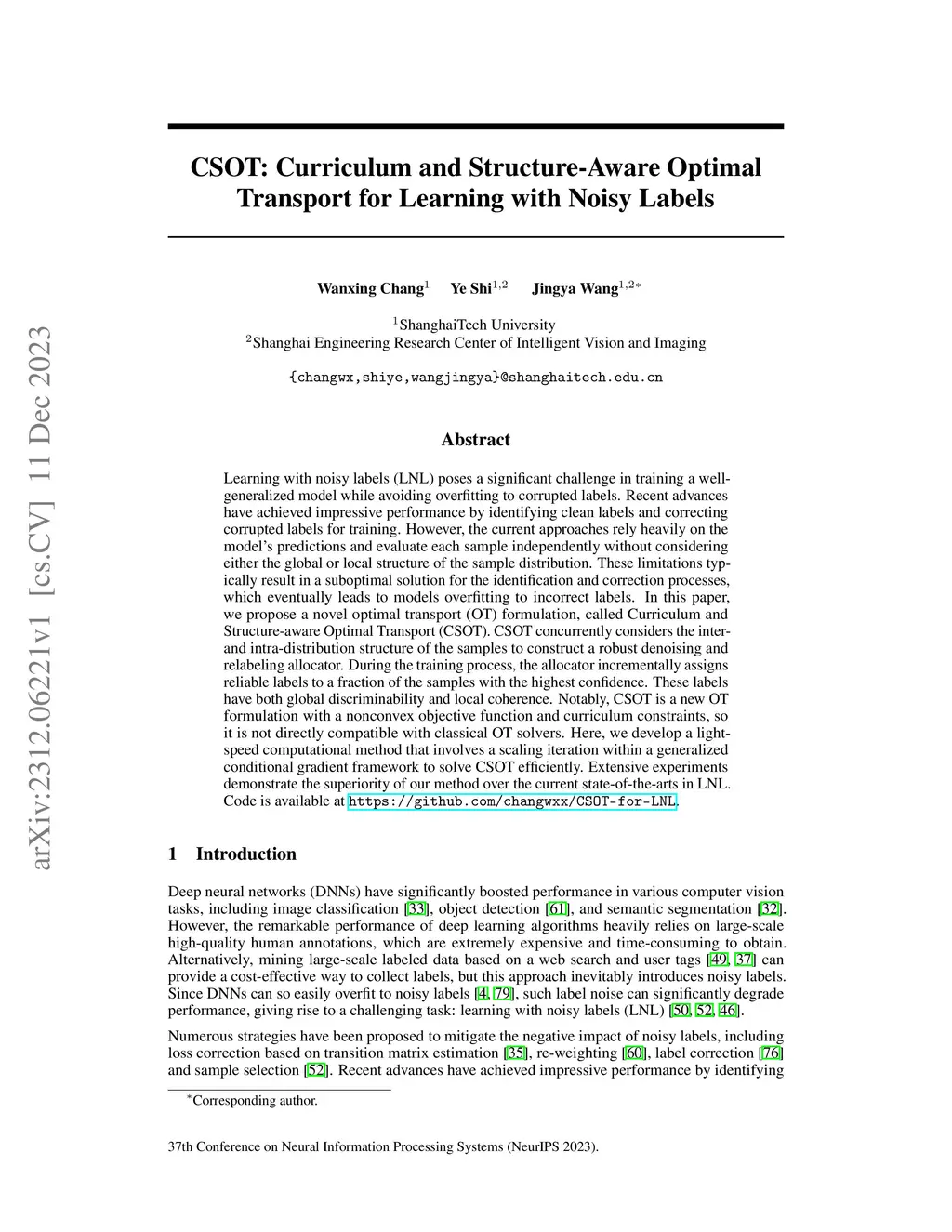 Learning with noisy labels (LNL) poses a significant challenge in training a well-generalized model while avoiding overfitting to corrupted labels. Recent advances have achieved impressive performance by identifying clean labels and correcting corrupted labels for training. However, the current approaches rely heavily on the model's predictions and evaluate each sample independently without considering either the global and local structure of the sample distribution. These limitations typically result in a suboptimal solution for the identification and correction processes, which eventually leads to models overfitting to incorrect labels. In this paper, we propose a novel optimal transport (OT) formulation, called Curriculum and Structure-aware Optimal Transport (CSOT). CSOT concurrently considers the inter- and intra-distribution structure of the samples to construct a robust denoising and relabeling allocator. During the training process, the allocator incrementally assigns reliable labels to a fraction of the samples with the highest confidence. These labels have both global discriminability and local coherence. Notably, CSOT is a new OT formulation with a nonconvex objective function and curriculum constraints, so it is not directly compatible with classical OT solvers. Here, we develop a lightspeed computational method that involves a scaling iteration within a generalized conditional gradient framework to solve CSOT efficiently. Extensive experiments demonstrate the superiority of our method over the current state-of-the-arts in LNL. Code is available at https://github.com/changwxx/CSOT-for-LNL.