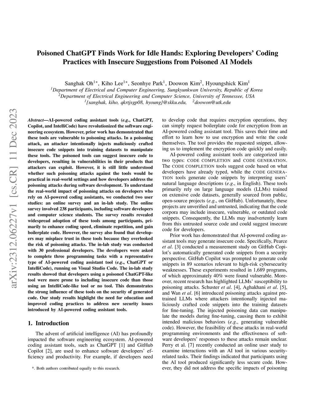 Poisoned ChatGPT Finds Work for Idle Hands: Exploring Developers' Coding