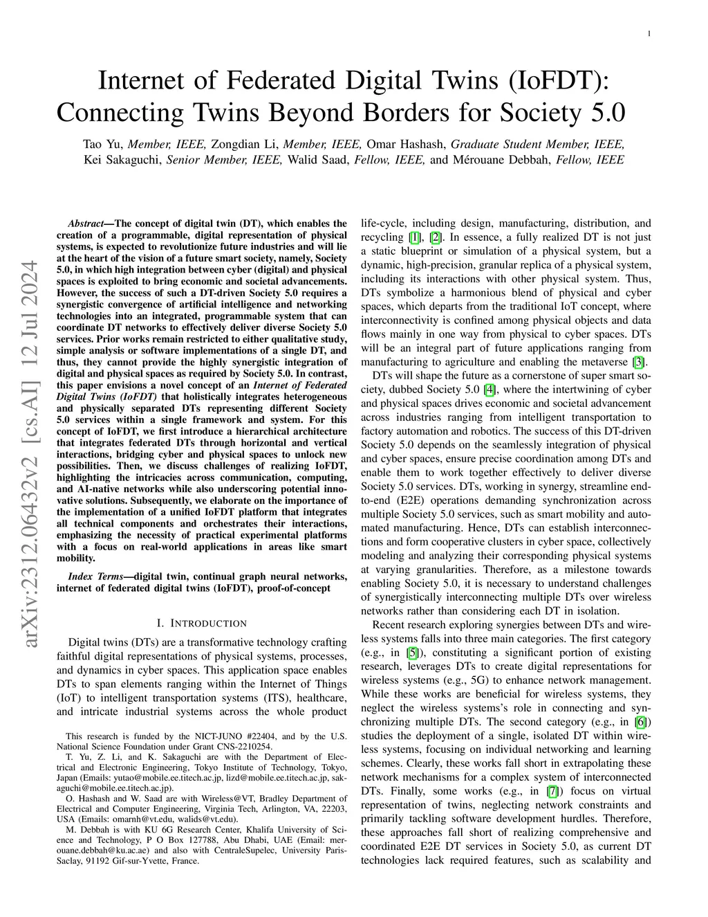 The concept of digital twin (DT), which enables the creation of a programmable, digital representation of physical systems, is expected to revolutionize future industries and will lie at the heart of the vision of a future smart society, namely, Society 5.0, in which high integration between cyber (digital) and physical spaces is exploited to bring economic and societal advancements. However, the success of such a DT-driven Society 5.0 requires a synergistic convergence of artificial intelligence and networking technologies into an integrated, programmable system that can coordinate DT networks to effectively deliver diverse Society 5.0 services. Prior works remain restricted to either qualitative study, simple analysis or software implementations of a single DT, and thus, they cannot provide the highly synergistic integration of digital and physical spaces as required by Society 5.0. In contrast, this paper envisions a novel concept of an Internet of Federated Digital Twins (IoFDT) that holistically integrates heterogeneous and physically separated DTs representing different Society 5.0 services within a single framework and system. For this concept of IoFDT, we first introduce a hierarchical architecture that integrates federated DTs through horizontal and vertical interactions, bridging cyber and physical spaces to unlock new possibilities. Then, we discuss challenges of realizing IoFDT, highlighting the intricacies across communication, computing, and AI-native networks while also underscoring potential innovative solutions. Subsequently, we elaborate on the importance of the implementation of a unified IoFDT platform that integrates all technical components and orchestrates their interactions, emphasizing the necessity of practical experimental platforms with a focus on real-world applications in areas like smart mobility.