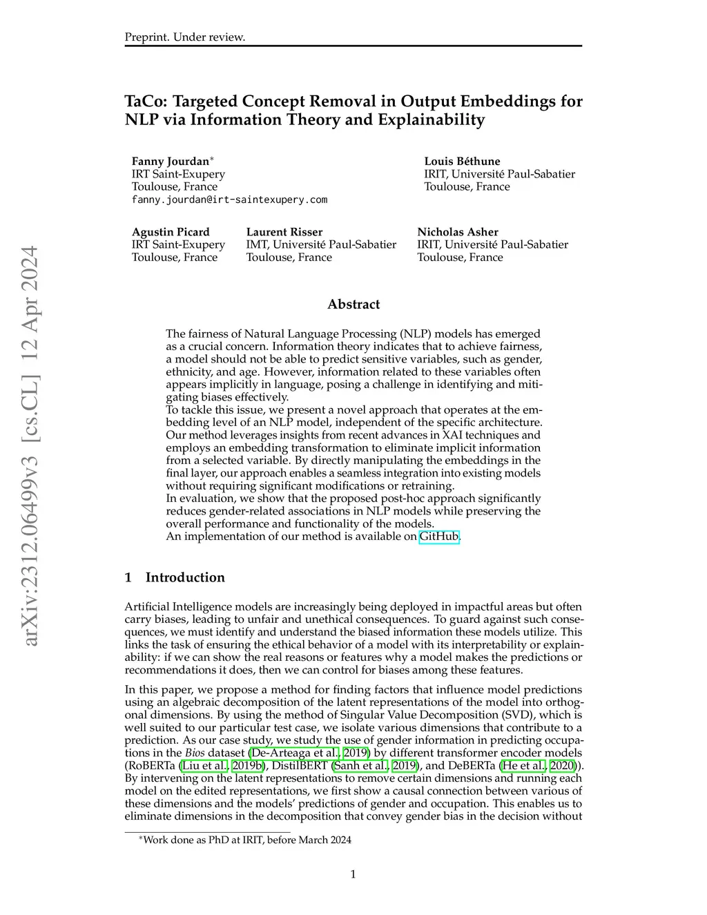 The fairness of Natural Language Processing (NLP) models has emerged as a crucial concern. Information theory indicates that to achieve fairness, a model should not be able to predict sensitive variables, such as gender, ethnicity, and age. However, information related to these variables often appears implicitly in language, posing a challenge in identifying and mitigating biases effectively. To tackle this issue, we present a novel approach that operates at the embedding level of an NLP model, independent of the specific architecture. Our method leverages insights from recent advances in XAI techniques and employs an embedding transformation to eliminate implicit information from a selected variable. By directly manipulating the embeddings in the final layer, our approach enables a seamless integration into existing models without requiring significant modifications or retraining. In evaluation, we show that the proposed post-hoc approach significantly reduces gender-related associations in NLP models while preserving the overall performance and functionality of the models. An implementation of our method is available: https://github.com/fanny-jourdan/TaCo