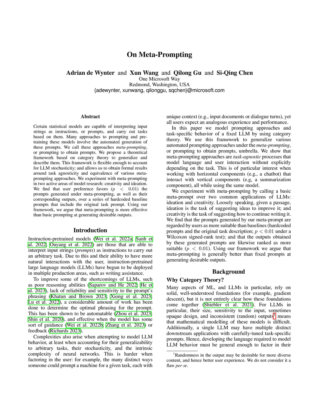 Modern large language models (LLMs) are capable of interpreting input strings as instructions, or prompts, and carry out tasks based on them. Unlike traditional learners, LLMs cannot use back-propagation to obtain feedback, and condition their output in situ in a phenomenon known as in-context learning (ICL). Many approaches to prompting and pre-training these models involve the automated generation of these prompts, also known as meta-prompting, or prompting to obtain prompts. However, they do not formally describe the properties and behavior of the LLMs themselves. We propose a theoretical framework based on category theory to generalize and describe ICL and LLM behavior when interacting with users. Our framework allows us to obtain formal results around task agnosticity and equivalence of various meta-prompting approaches. Using our framework and experimental results we argue that meta-prompting is more effective than basic prompting at generating desirable outputs.