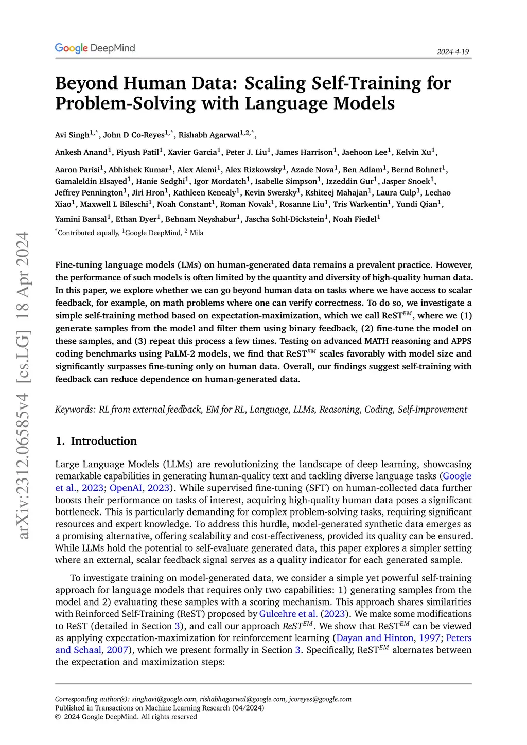 Fine-tuning language models~(LMs) on human-generated data remains a prevalent practice. However, the performance of such models is often limited by the quantity and diversity of high-quality human data. In this paper, we explore whether we can go beyond human data on tasks where we have access to scalar feedback, for example, on math problems where one can verify correctness. To do so, we investigate a simple self-training method based on expectation-maximization, which we call ReST, where we (1) generate samples from the model and filter them using binary feedback, (2) fine-tune the model on these samples, and (3) repeat this process a few times. Testing on advanced MATH reasoning and APPS coding benchmarks using PaLM-2 models, we find that ReST scales favorably with model size and significantly surpasses fine-tuning only on human data. Overall, our findings suggest self-training with feedback can substantially reduce dependence on human-generated data.