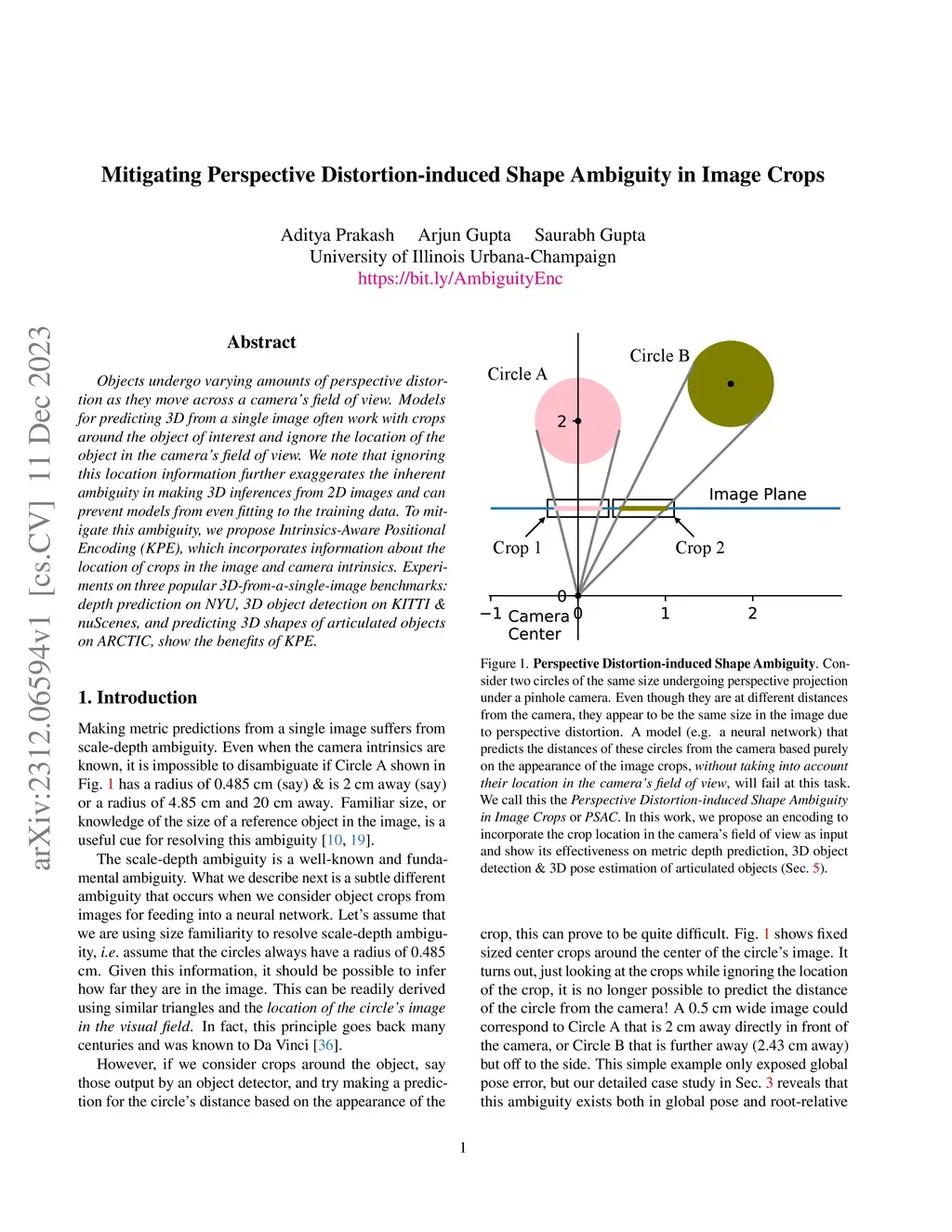 Objects undergo varying amounts of perspective distortion as they move across a camera's field of view. Models for predicting 3D from a single image often work with crops around the object of interest and ignore the location of the object in the camera's field of view. We note that ignoring this location information further exaggerates the inherent ambiguity in making 3D inferences from 2D images and can prevent models from even fitting to the training data. To mitigate this ambiguity, we propose Intrinsics-Aware Positional Encoding (KPE), which incorporates information about the location of crops in the image and camera intrinsics. Experiments on three popular 3D-from-a-single-image benchmarks: depth prediction on NYU, 3D object detection on KITTI & nuScenes, and predicting 3D shapes of articulated objects on ARCTIC, show the benefits of KPE.