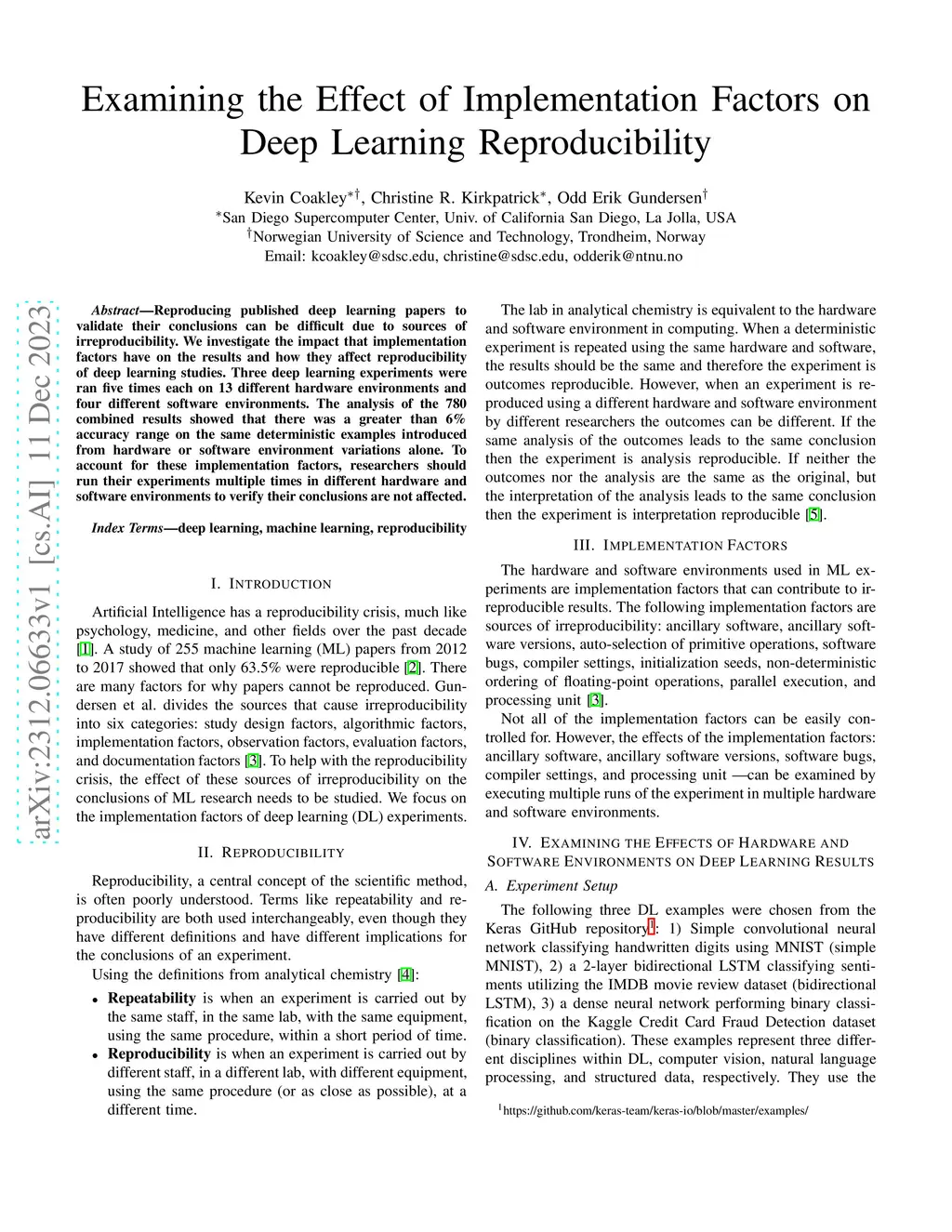 Reproducing published deep learning papers to validate their conclusions can be difficult due to sources of irreproducibility. We investigate the impact that implementation factors have on the results and how they affect reproducibility of deep learning studies. Three deep learning experiments were ran five times each on 13 different hardware environments and four different software environments. The analysis of the 780 combined results showed that there was a greater than 6% accuracy range on the same deterministic examples introduced from hardware or software environment variations alone. To account for these implementation factors, researchers should run their experiments multiple times in different hardware and software environments to verify their conclusions are not affected.