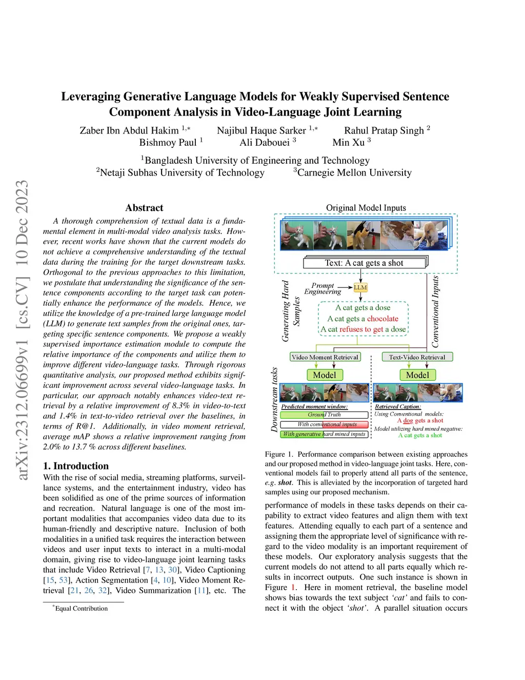 A thorough comprehension of textual data is a fundamental element in multi-modal video analysis tasks. However, recent works have shown that the current models do not achieve a comprehensive understanding of the textual data during the training for the target downstream tasks. Orthogonal to the previous approaches to this limitation, we postulate that understanding the significance of the sentence components according to the target task can potentially enhance the performance of the models. Hence, we utilize the knowledge of a pre-trained large language model (LLM) to generate text samples from the original ones, targeting specific sentence components. We propose a weakly supervised importance estimation module to compute the relative importance of the components and utilize them to improve different video-language tasks. Through rigorous quantitative analysis, our proposed method exhibits significant improvement across several video-language tasks. In particular, our approach notably enhances video-text retrieval by a relative improvement of 8.3\% in video-to-text and 1.4\% in text-to-video retrieval over the baselines, in terms of R@1. Additionally, in video moment retrieval, average mAP shows a relative improvement ranging from 2.0\% to 13.7 \% across different baselines.