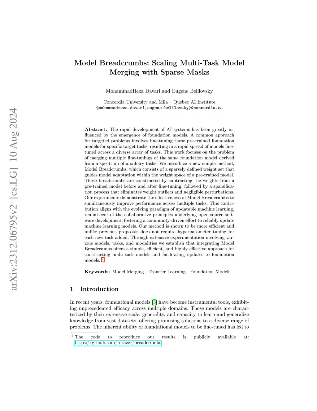 Model Breadcrumbs: Scaling Multi-Task Model Merging with Sparse Masks