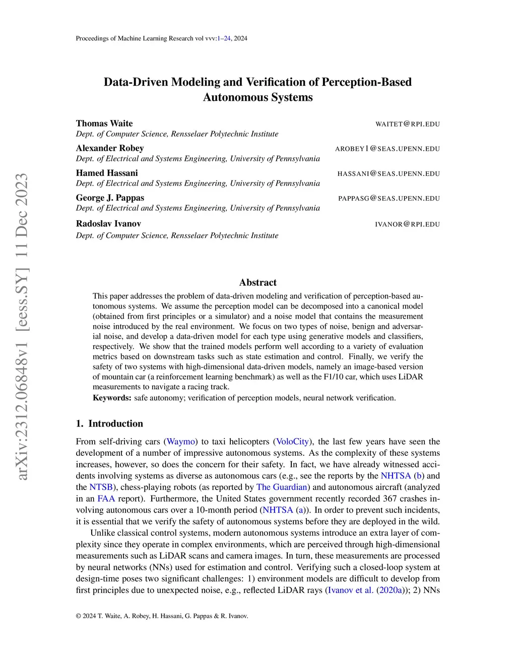 This paper addresses the problem of data-driven modeling and verification of perception-based autonomous systems. We assume the perception model can be decomposed into a canonical model (obtained from first principles or a simulator) and a noise model that contains the measurement noise introduced by the real environment. We focus on two types of noise, benign and adversarial noise, and develop a data-driven model for each type using generative models and classifiers, respectively. We show that the trained models perform well according to a variety of evaluation metrics based on downstream tasks such as state estimation and control. Finally, we verify the safety of two systems with high-dimensional data-driven models, namely an image-based version of mountain car (a reinforcement learning benchmark) as well as the F1/10 car, which uses LiDAR measurements to navigate a racing track.