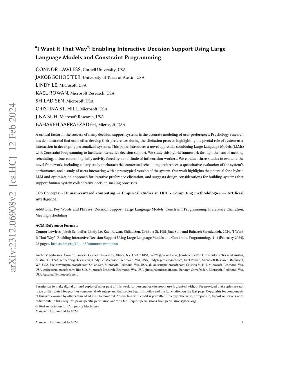 A critical factor in the success of decision support systems is the accurate modeling of user preferences. Psychology research has demonstrated that users often develop their preferences during the elicitation process, highlighting the pivotal role of system-user interaction in developing personalized systems. This paper introduces a novel approach, combining Large Language Models (LLMs) with Constraint Programming to facilitate interactive decision support. We study this hybrid framework through the lens of meeting scheduling, a time-consuming daily activity faced by a multitude of information workers. We conduct three studies to evaluate the novel framework, including a diary study (n=64) to characterize contextual scheduling preferences, a quantitative evaluation of the system's performance, and a user study (n=10) with a prototype system. Our work highlights the potential for a hybrid LLM and optimization approach for iterative preference elicitation and design considerations for building systems that support human-system collaborative decision-making processes.