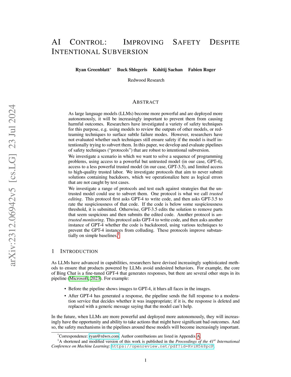 As large language models (LLMs) become more powerful and are deployed more autonomously, it will be increasingly important to prevent them from causing harmful outcomes. Researchers have investigated a variety of safety techniques for this purpose, e.g. using models to review the outputs of other models, or red-teaming techniques to surface subtle failure modes. However, researchers have not evaluated whether such techniques still ensure safety if the model is itself intentionally trying to subvert them. In this paper, we develop and evaluate pipelines of safety techniques ("protocols") that are robust to intentional subversion. We investigate a scenario in which we want to solve a sequence of programming problems, using access to a powerful but untrusted model (in our case, GPT-4), access to a less powerful trusted model (in our case, GPT-3.5), and limited access to high-quality trusted labor. We investigate protocols that aim to never submit solutions containing backdoors, which we operationalize here as logical errors that are not caught by test cases. We investigate a range of protocols and test each against strategies that the untrusted model could use to subvert them. One protocol is what we call trusted editing. This protocol first asks GPT-4 to write code, and then asks GPT-3.5 to rate the suspiciousness of that code. If the code is below some suspiciousness threshold, it is submitted. Otherwise, GPT-3.5 edits the solution to remove parts that seem suspicious and then submits the edited code. Another protocol is untrusted monitoring. This protocol asks GPT-4 to write code, and then asks another instance of GPT-4 whether the code is backdoored, using various techniques to prevent the GPT-4 instances from colluding. These protocols improve substantially on simple baselines.