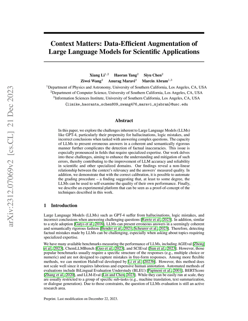 In this paper, we explore the challenges inherent to Large Language Models (LLMs) like GPT-4, particularly their propensity for hallucinations, logic mistakes, and incorrect conclusions when tasked with answering complex questions. The capacity of LLMs to present erroneous answers in a coherent and semantically rigorous manner further complicates the detection of factual inaccuracies. This issue is especially pronounced in fields that require specialized expertise. Our work delves into these challenges, aiming to enhance the understanding and mitigation of such errors, thereby contributing to the improvement of LLM accuracy and reliability in scientific and other specialized domains. Our findings reveal a non-linear relationship between the context's relevancy and the answers' measured quality. In addition, we demonstrate that with the correct calibration, it is possible to automate the grading procedure -- a finding suggesting that, at least to some degree, the LLMs can be used to self-examine the quality of their own performance. Finally, we describe an experimental platform that can be seen as a proof-of-concept of the techniques described in this work.