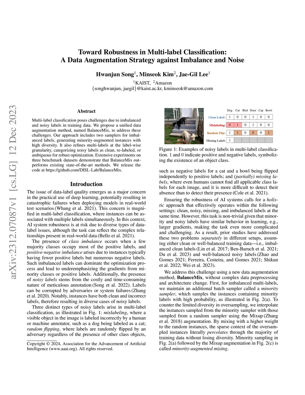 Multi-label classification poses challenges due to imbalanced and noisy labels in training data. We propose a unified data augmentation method, named BalanceMix, to address these challenges. Our approach includes two samplers for imbalanced labels, generating minority-augmented instances with high diversity. It also refines multi-labels at the label-wise granularity, categorizing noisy labels as clean, re-labeled, or ambiguous for robust optimization. Extensive experiments on three benchmark datasets demonstrate that BalanceMix outperforms existing state-of-the-art methods. We release the code at https://github.com/DISL-Lab/BalanceMix.