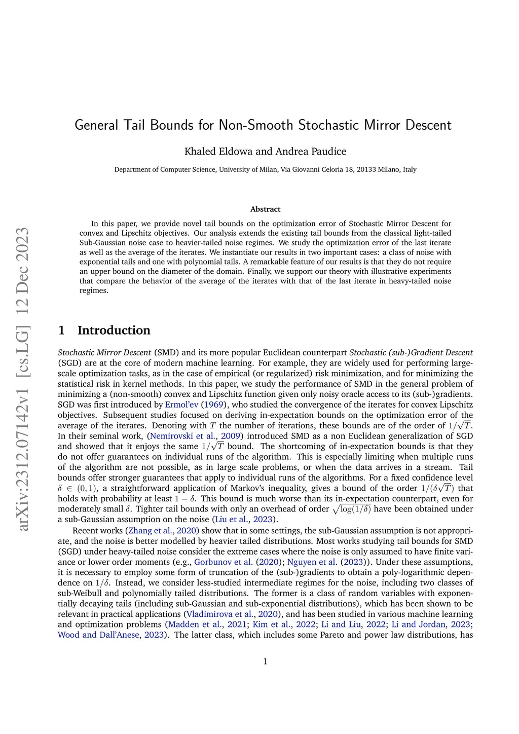 In this paper, we provide novel tail bounds on the optimization error of Stochastic Mirror Descent for convex and Lipschitz objectives. Our analysis extends the existing tail bounds from the classical light-tailed Sub-Gaussian noise case to heavier-tailed noise regimes. We study the optimization error of the last iterate as well as the average of the iterates. We instantiate our results in two important cases: a class of noise with exponential tails and one with polynomial tails. A remarkable feature of our results is that they do not require an upper bound on the diameter of the domain. Finally, we support our theory with illustrative experiments that compare the behavior of the average of the iterates with that of the last iterate in heavy-tailed noise regimes.