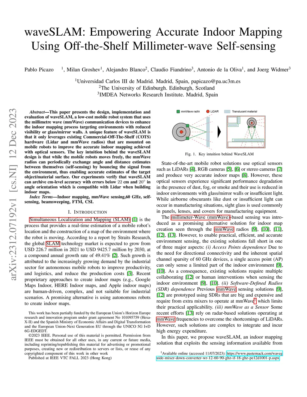 This paper presents the design, implementation and evaluation of waveSLAM, a low-cost mobile robot system that uses the millimetre wave (mmWave) communication devices to enhance the indoor mapping process targeting environments with reduced visibility or glass/mirror walls. A unique feature of waveSLAM is that it only leverages existing Commercial-Off-The-Shelf (COTS) hardware (Lidar and mmWave radios) that are mounted on mobile robots to improve the accurate indoor mapping achieved with optical sensors. The key intuition behind the waveSLAM design is that while the mobile robots moves freely, the mmWave radios can periodically exchange angle and distance estimates between themselves (self-sensing) by bouncing the signal from the environment, thus enabling accurate estimates of the target object/material surface. Our experiments verify that waveSLAM can archive cm-level accuracy with errors below 22 cm and 20deg in angle orientation which is compatible with Lidar when building indoor maps.