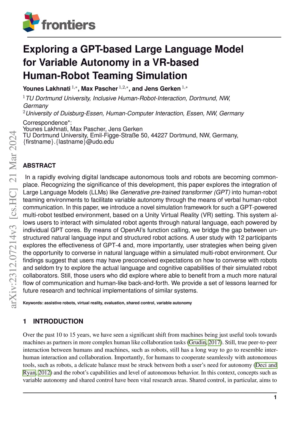 In a rapidly evolving digital landscape autonomous tools and robots are becoming commonplace. Recognizing the significance of this development, this paper explores the integration of Large Language Models (LLMs) like Generative pre-trained transformer (GPT) into human-robot teaming environments to facilitate variable autonomy through the means of verbal human-robot communication. In this paper, we introduce a novel framework for such a GPT-powered multi-robot testbed environment, based on a Unity Virtual Reality (VR) setting. This system allows users to interact with robot agents through natural language, each powered by individual GPT cores. By means of OpenAI's function calling, we bridge the gap between unstructured natural language input and structure robot actions. A user study with 12 participants explores the effectiveness of GPT-4 and, more importantly, user strategies when being given the opportunity to converse in natural language within a multi-robot environment. Our findings suggest that users may have preconceived expectations on how to converse with robots and seldom try to explore the actual language and cognitive capabilities of their robot collaborators. Still, those users who did explore where able to benefit from a much more natural flow of communication and human-like back-and-forth. We provide a set of lessons learned for future research and technical implementations of similar systems.