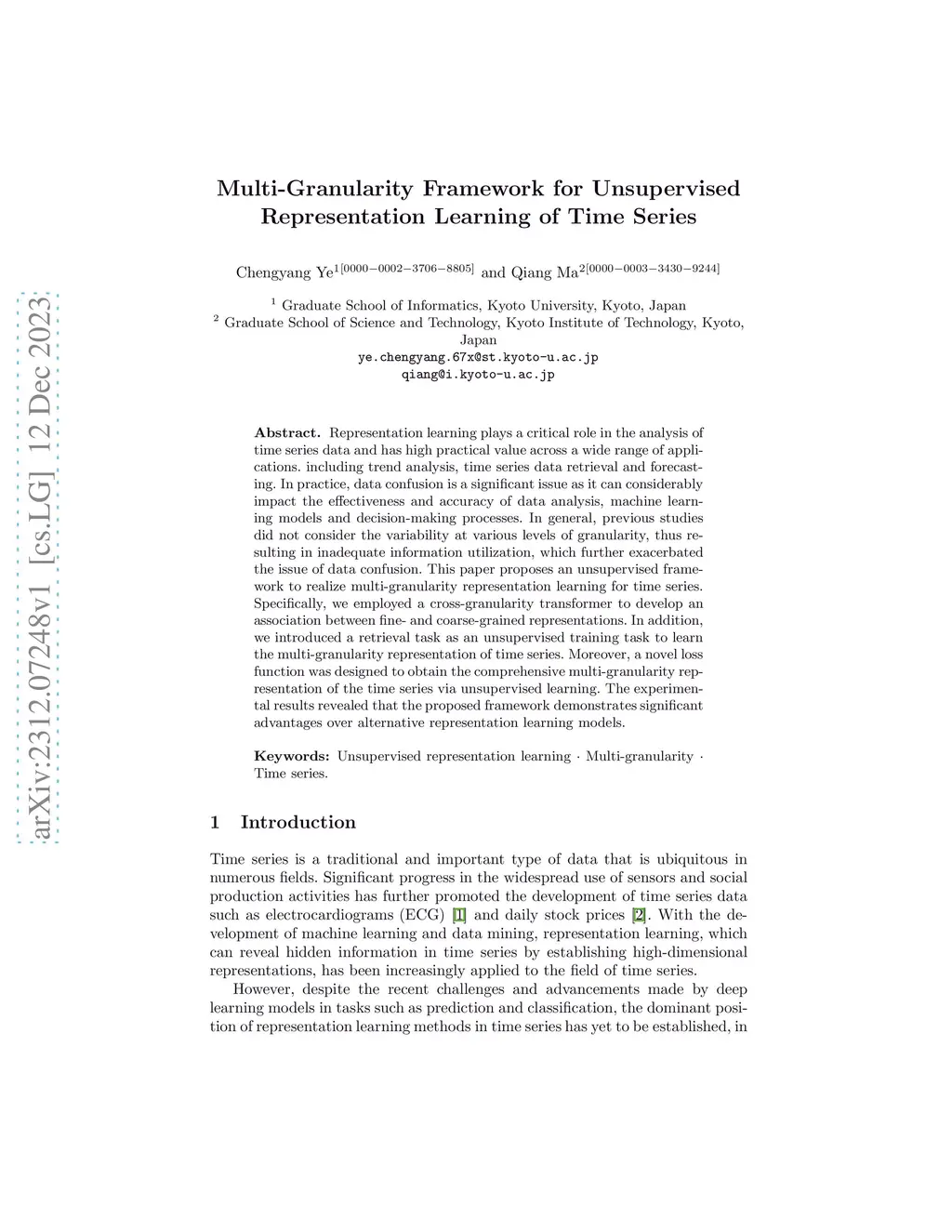 Representation learning plays a critical role in the analysis of time series data and has high practical value across a wide range of applications. including trend analysis, time series data retrieval and forecasting. In practice, data confusion is a significant issue as it can considerably impact the effectiveness and accuracy of data analysis, machine learning models and decision-making processes. In general, previous studies did not consider the variability at various levels of granularity, thus resulting in inadequate information utilization, which further exacerbated the issue of data confusion. This paper proposes an unsupervised framework to realize multi-granularity representation learning for time series. Specifically, we employed a cross-granularity transformer to develop an association between fine- and coarse-grained representations. In addition, we introduced a retrieval task as an unsupervised training task to learn the multi-granularity representation of time series. Moreover, a novel loss function was designed to obtain the comprehensive multi-granularity representation of the time series via unsupervised learning. The experimental results revealed that the proposed framework demonstrates significant advantages over alternative representation learning models.