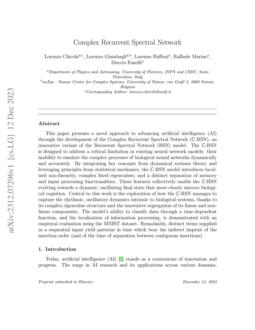 This paper presents a novel approach to advancing artificial intelligence (AI) through the development of the Complex Recurrent Spectral Network (-RSN), an innovative variant of the Recurrent Spectral Network (RSN) model. The -RSN is designed to address a critical limitation in existing neural network models: their inability to emulate the complex processes of biological neural networks dynamically and accurately. By integrating key concepts from dynamical systems theory and leveraging principles from statistical mechanics, the -RSN model introduces localized non-linearity, complex fixed eigenvalues, and a distinct separation of memory and input processing functionalities. These features collectively enable the -RSN evolving towards a dynamic, oscillating final state that more closely mirrors biological cognition. Central to this work is the exploration of how the -RSN manages to capture the rhythmic, oscillatory dynamics intrinsic to biological systems, thanks to its complex eigenvalue structure and the innovative segregation of its linear and non-linear components. The model's ability to classify data through a time-dependent function, and the localization of information processing, is demonstrated with an empirical evaluation using the MNIST dataset. Remarkably, distinct items supplied as a sequential input yield patterns in time which bear the indirect imprint of the insertion order (and of the time of separation between contiguous insertions).
