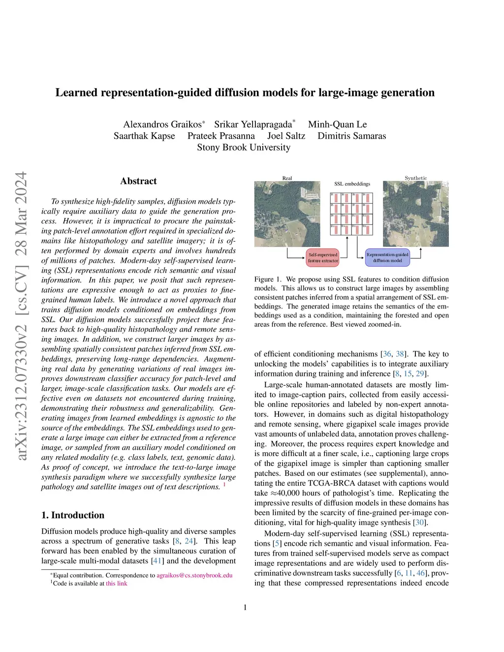 To synthesize high-fidelity samples, diffusion models typically require auxiliary data to guide the generation process. However, it is impractical to procure the painstaking patch-level annotation effort required in specialized domains like histopathology and satellite imagery; it is often performed by domain experts and involves hundreds of millions of patches. Modern-day self-supervised learning (SSL) representations encode rich semantic and visual information. In this paper, we posit that such representations are expressive enough to act as proxies to fine-grained human labels. We introduce a novel approach that trains diffusion models conditioned on embeddings from SSL. Our diffusion models successfully project these features back to high-quality histopathology and remote sensing images. In addition, we construct larger images by assembling spatially consistent patches inferred from SSL embeddings, preserving long-range dependencies. Augmenting real data by generating variations of real images improves downstream classifier accuracy for patch-level and larger, image-scale classification tasks. Our models are effective even on datasets not encountered during training, demonstrating their robustness and generalizability. Generating images from learned embeddings is agnostic to the source of the embeddings. The SSL embeddings used to generate a large image can either be extracted from a reference image, or sampled from an auxiliary model conditioned on any related modality (e.g. class labels, text, genomic data). As proof of concept, we introduce the text-to-large image synthesis paradigm where we successfully synthesize large pathology and satellite images out of text descriptions.