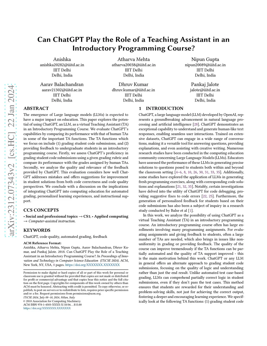 Can ChatGPT Play the Role of a Teaching Assistant in an Introductory