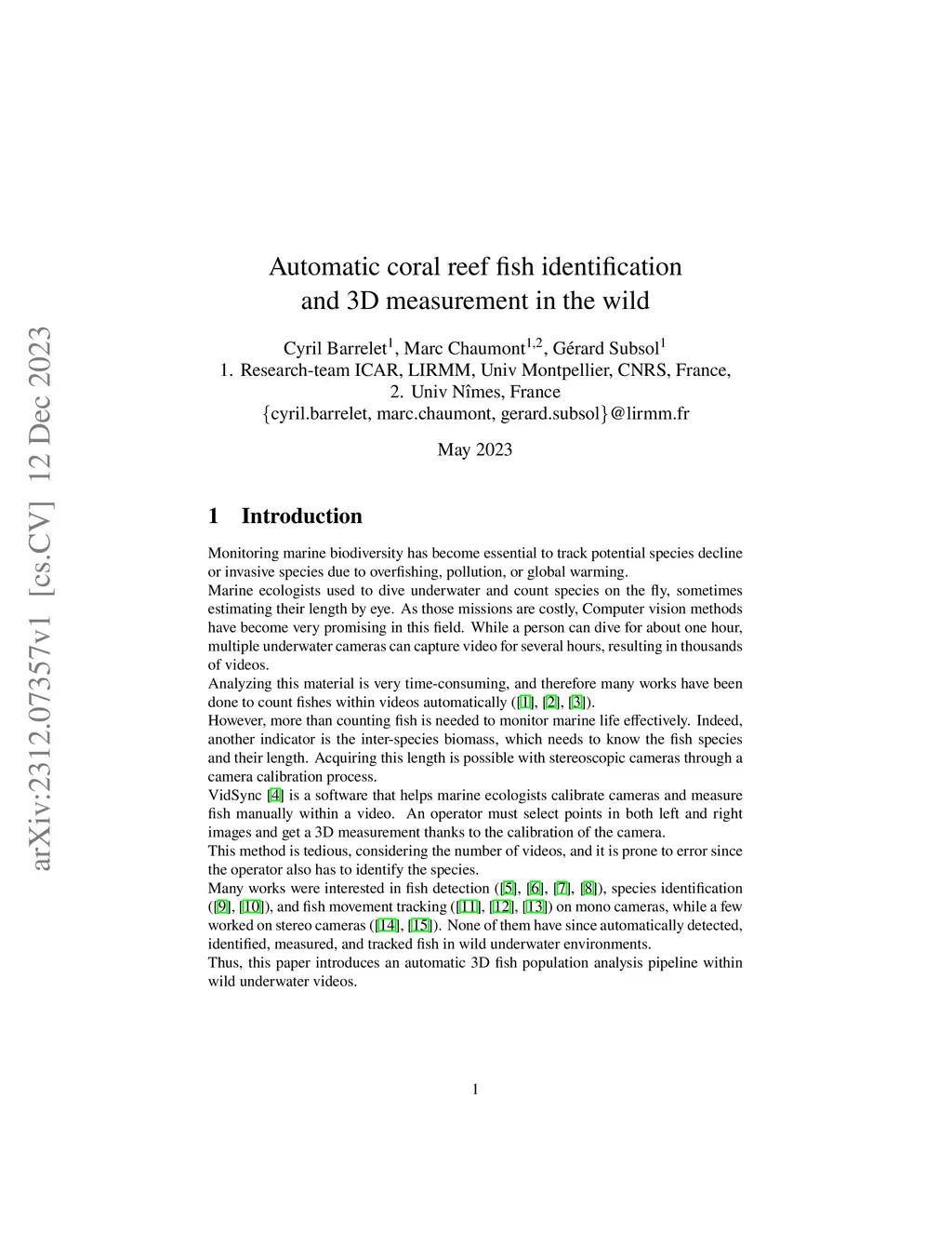 Automatic coral reef fish identification and 3D measurement in the wild