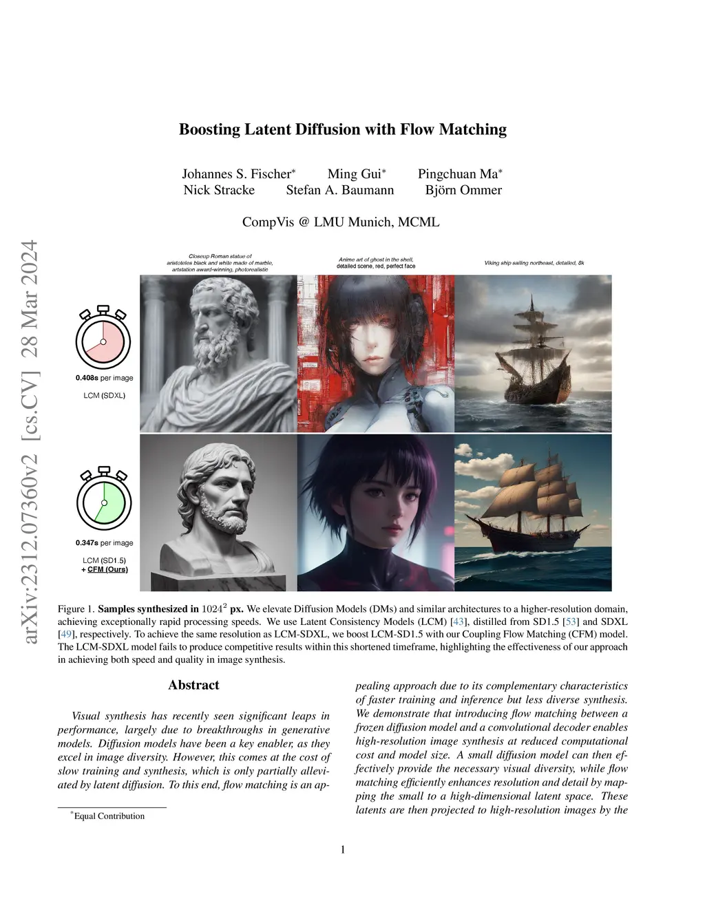 Recently, there has been tremendous progress in visual synthesis and the underlying generative models. Here, diffusion models (DMs) stand out particularly, but lately, flow matching (FM) has also garnered considerable interest. While DMs excel in providing diverse images, they suffer from long training and slow generation. With latent diffusion, these issues are only partially alleviated. Conversely, FM offers faster training and inference but exhibits less diversity in synthesis. We demonstrate that introducing FM between the Diffusion model and the convolutional decoder offers high-resolution image synthesis with reduced computational cost and model size. Diffusion can then efficiently provide the necessary generation diversity. FM compensates for the lower resolution, mapping the small latent space to a high-dimensional one. Subsequently, the convolutional decoder of the LDM maps these latents to high-resolution images. By combining the diversity of DMs, the efficiency of FMs, and the effectiveness of convolutional decoders, we achieve state-of-the-art high-resolution image synthesis at with minimal computational cost. Importantly, our approach is orthogonal to recent approximation and speed-up strategies for the underlying DMs, making it easily integrable into various DM frameworks.