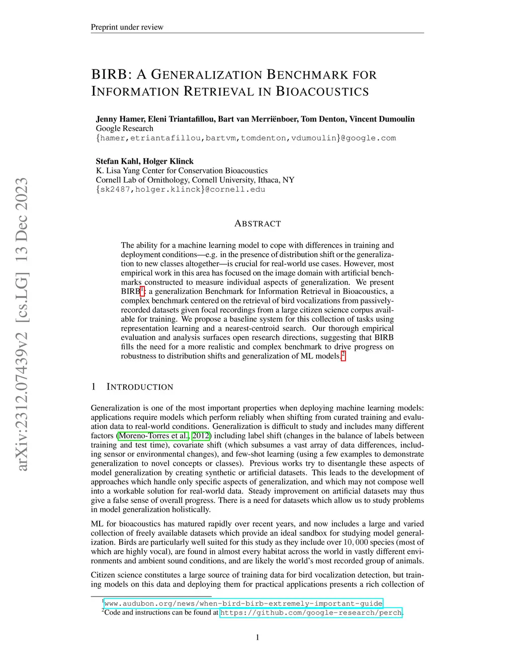 The ability for a machine learning model to cope with differences in training and deployment conditions--e.g. in the presence of distribution shift or the generalization to new classes altogether--is crucial for real-world use cases. However, most empirical work in this area has focused on the image domain with artificial benchmarks constructed to measure individual aspects of generalization. We present BIRB, a complex benchmark centered on the retrieval of bird vocalizations from passively-recorded datasets given focal recordings from a large citizen science corpus available for training. We propose a baseline system for this collection of tasks using representation learning and a nearest-centroid search. Our thorough empirical evaluation and analysis surfaces open research directions, suggesting that BIRB fills the need for a more realistic and complex benchmark to drive progress on robustness to distribution shifts and generalization of ML models.