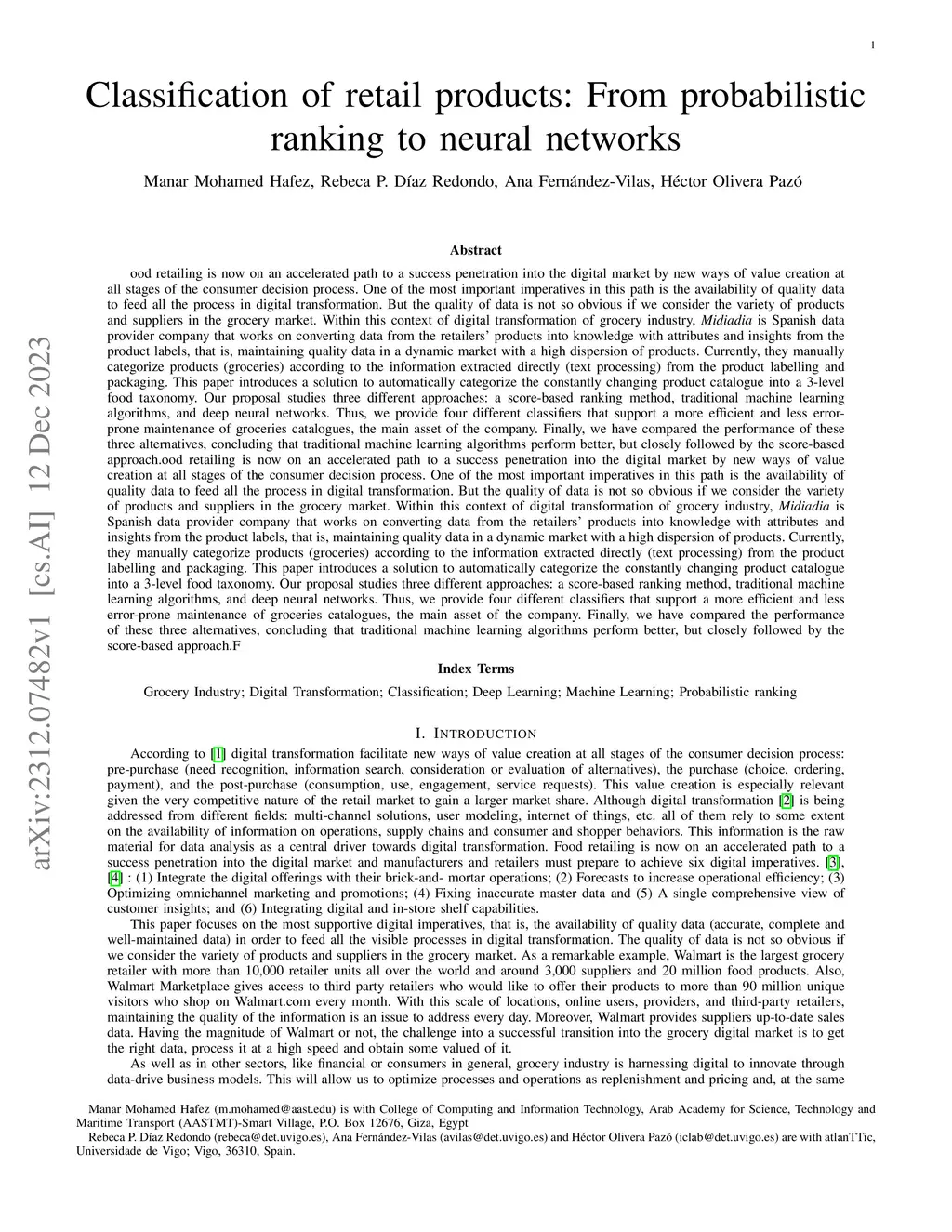 Food retailing is now on an accelerated path to a success penetration into the digital market by new ways of value creation at all stages of the consumer decision process. One of the most important imperatives in this path is the availability of quality data to feed all the process in digital transformation. But the quality of data is not so obvious if we consider the variety of products and suppliers in the grocery market. Within this context of digital transformation of grocery industry, \textit{Midiadia} is Spanish data provider company that works on converting data from the retailers' products into knowledge with attributes and insights from the product labels, that is, maintaining quality data in a dynamic market with a high dispersion of products. Currently, they manually categorize products (groceries) according to the information extracted directly (text processing) from the product labelling and packaging. This paper introduces a solution to automatically categorize the constantly changing product catalogue into a 3-level food taxonomy. Our proposal studies three different approaches: a score-based ranking method, traditional machine learning algorithms, and deep neural networks. Thus, we provide four different classifiers that support a more efficient and less error-prone maintenance of groceries catalogues, the main asset of the company. Finally, we have compared the performance of these three alternatives, concluding that traditional machine learning algorithms perform better, but closely followed by the score-based approach.