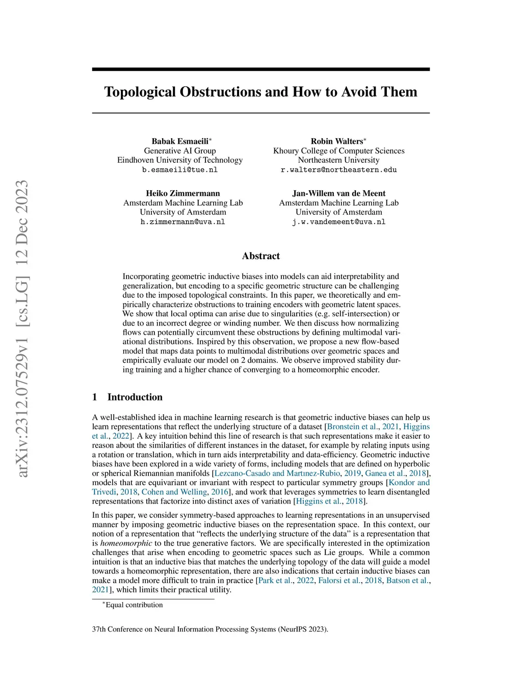 Incorporating geometric inductive biases into models can aid interpretability and generalization, but encoding to a specific geometric structure can be challenging due to the imposed topological constraints. In this paper, we theoretically and empirically characterize obstructions to training encoders with geometric latent spaces. We show that local optima can arise due to singularities (e.g. self-intersection) or due to an incorrect degree or winding number. We then discuss how normalizing flows can potentially circumvent these obstructions by defining multimodal variational distributions. Inspired by this observation, we propose a new flow-based model that maps data points to multimodal distributions over geometric spaces and empirically evaluate our model on 2 domains. We observe improved stability during training and a higher chance of converging to a homeomorphic encoder.