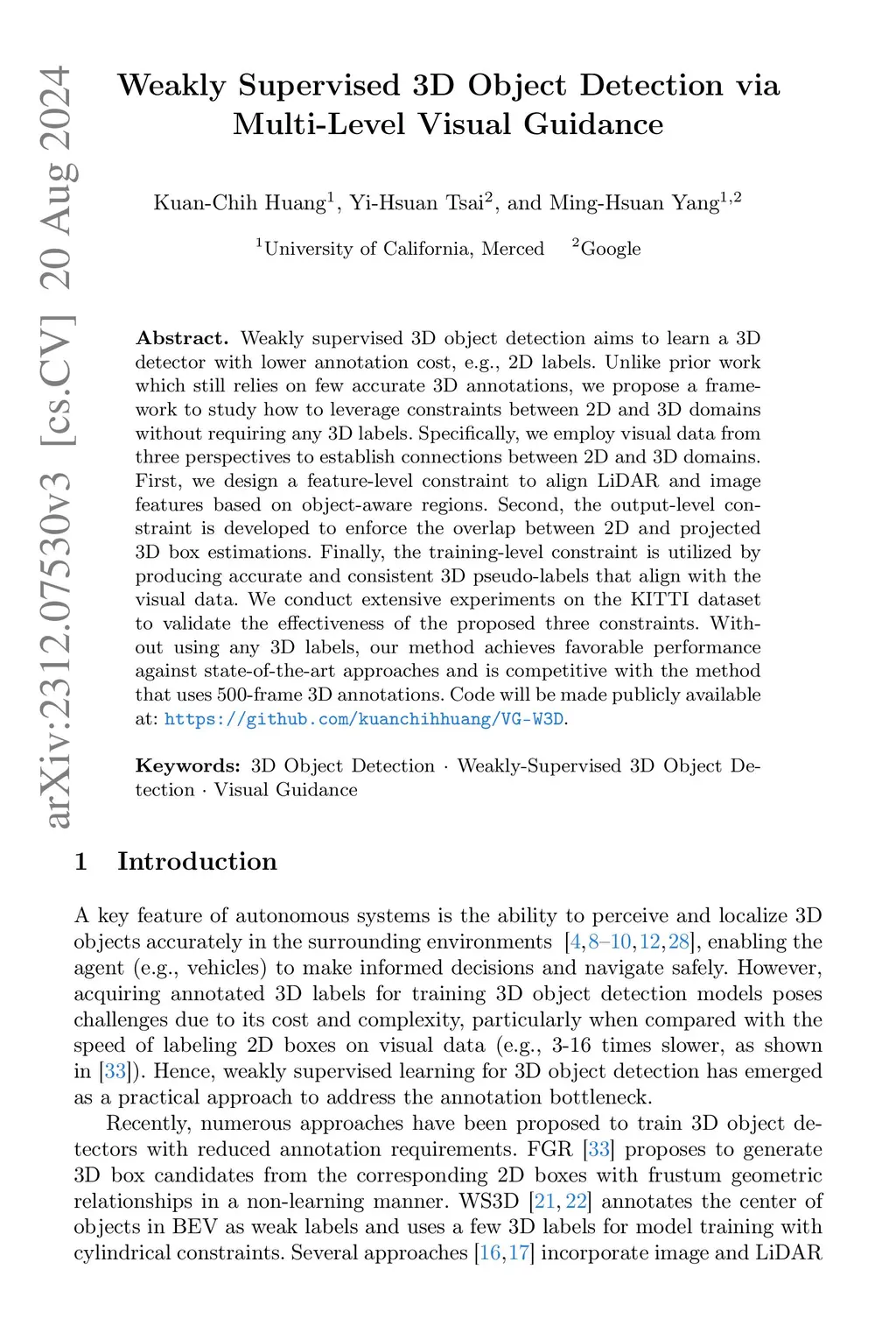 Weakly Supervised 3D Object Detection via Multi-Level Visual Guidance