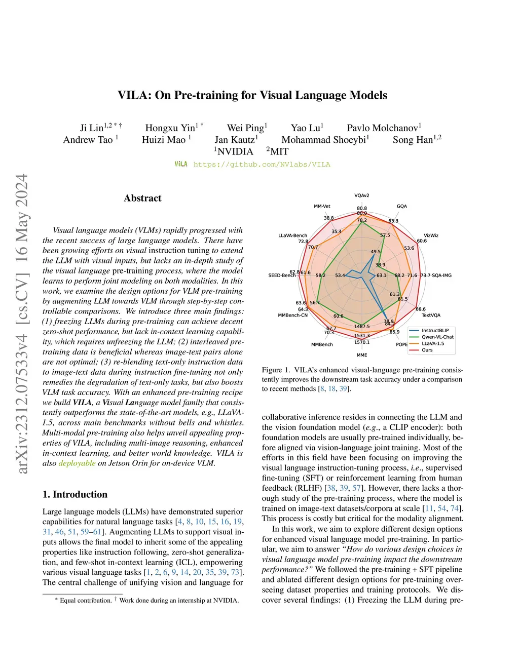 VILA: On Pre-training for Visual Language Models
