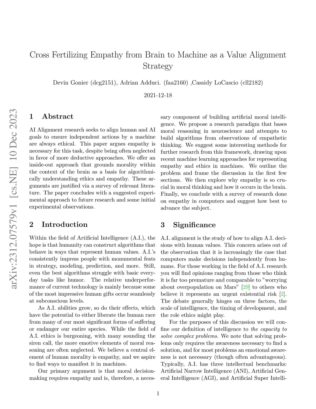 AI Alignment research seeks to align human and AI goals to ensure independent actions by a machine are always ethical. This paper argues empathy is necessary for this task, despite being often neglected in favor of more deductive approaches. We offer an inside-out approach that grounds morality within the context of the brain as a basis for algorithmically understanding ethics and empathy. These arguments are justified via a survey of relevant literature. The paper concludes with a suggested experimental approach to future research and some initial experimental observations.
