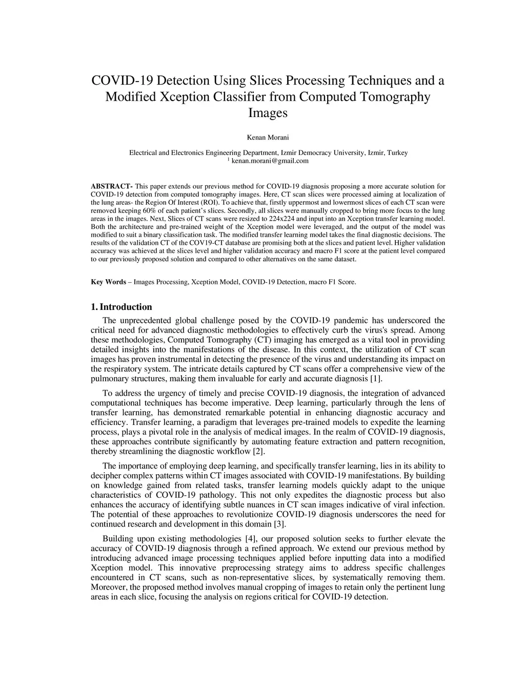This paper extends our previous method for COVID-19 diagnosis, proposing an enhanced solution for detecting COVID-19 from computed tomography (CT) images. To decrease model misclassifications, two key steps of image processing were employed. Firstly, the uppermost and lowermost slices were removed, preserving sixty percent of each patient's slices. Secondly, all slices underwent manual cropping to emphasize the lung areas. Subsequently, resized CT scans (224 by 224) were input into an Xception transfer learning model. Leveraging Xception's architecture and pre-trained weights, the modified model achieved binary classification. Promising results on the COV19-CT database showcased higher validation accuracy and macro F1 score at both the slice and patient levels compared to our previous solution and alternatives on the same dataset.