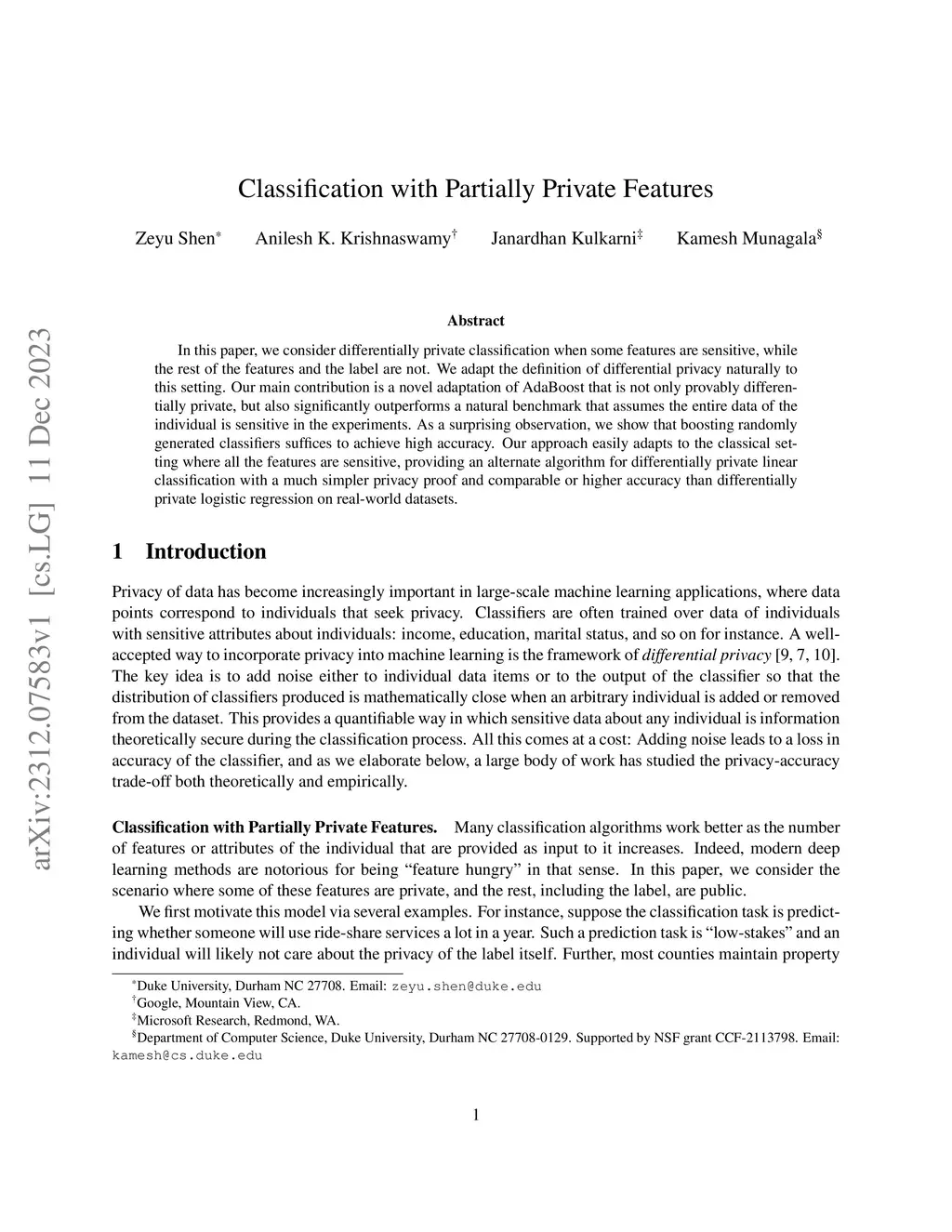 In this paper, we consider differentially private classification when some features are sensitive, while the rest of the features and the label are not. We adapt the definition of differential privacy naturally to this setting. Our main contribution is a novel adaptation of AdaBoost that is not only provably differentially private, but also significantly outperforms a natural benchmark that assumes the entire data of the individual is sensitive in the experiments. As a surprising observation, we show that boosting randomly generated classifiers suffices to achieve high accuracy. Our approach easily adapts to the classical setting where all the features are sensitive, providing an alternate algorithm for differentially private linear classification with a much simpler privacy proof and comparable or higher accuracy than differentially private logistic regression on real-world datasets.