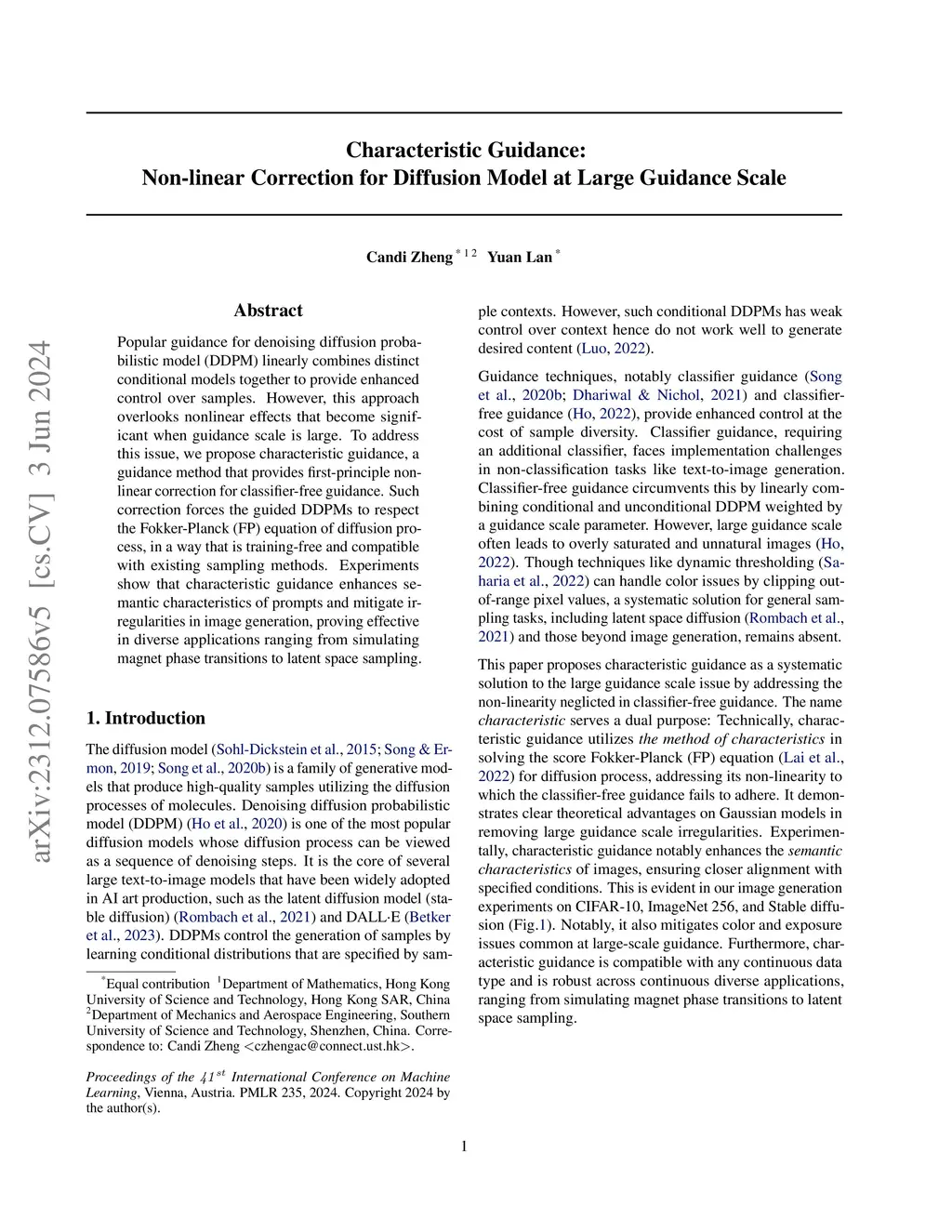 Popular guidance for denoising diffusion probabilistic model (DDPM) linearly combines distinct conditional models together to provide enhanced control over samples. However, this approach overlooks nonlinear effects that become significant when guidance scale is large. To address this issue, we propose characteristic guidance, a guidance method that provides first-principle non-linear correction for classifier-free guidance. Such correction forces the guided DDPMs to respect the Fokker-Planck (FP) equation of diffusion process, in a way that is training-free and compatible with existing sampling methods. Experiments show that characteristic guidance enhances semantic characteristics of prompts and mitigate irregularities in image generation, proving effective in diverse applications ranging from simulating magnet phase transitions to latent space sampling.