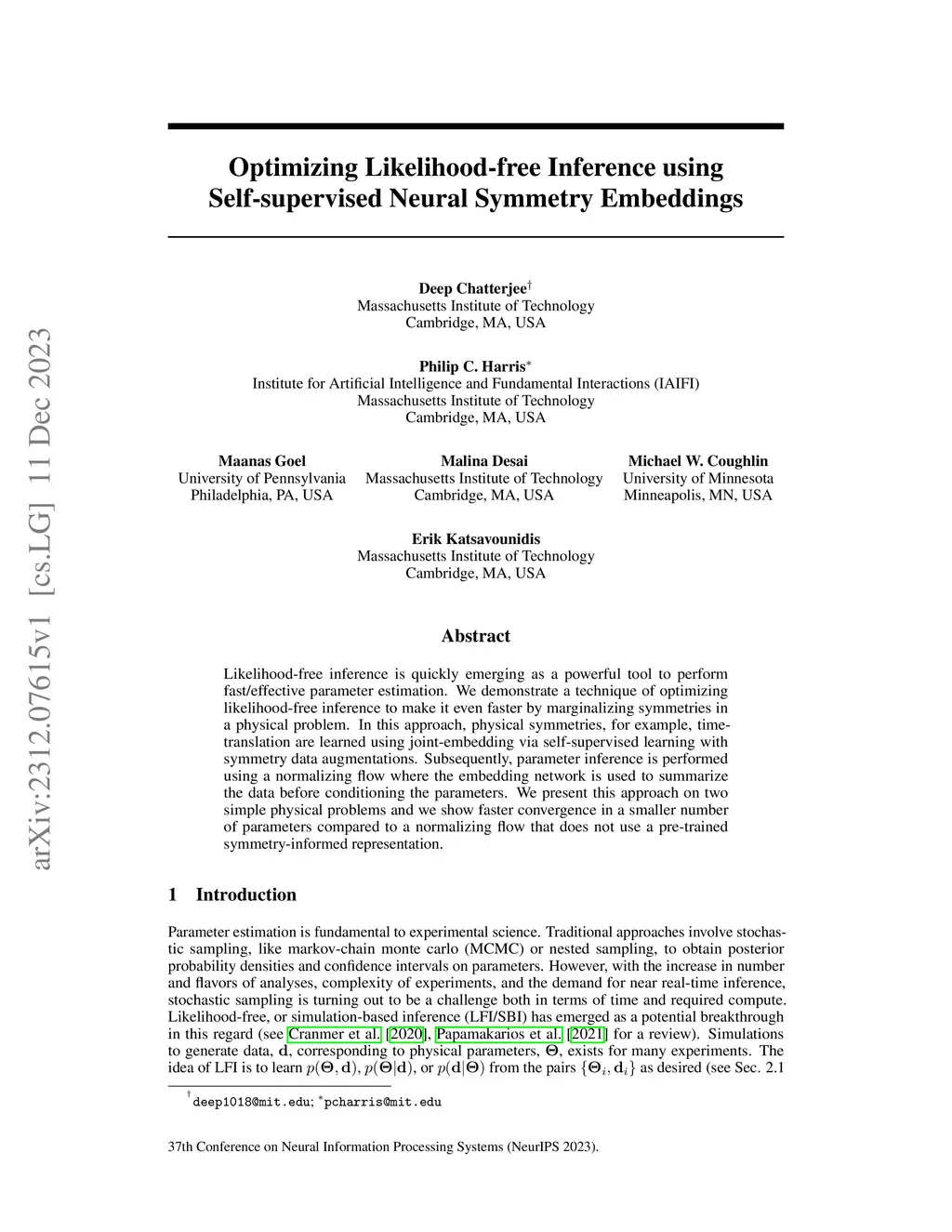 Likelihood-free inference is quickly emerging as a powerful tool to perform fast/effective parameter estimation. We demonstrate a technique of optimizing likelihood-free inference to make it even faster by marginalizing symmetries in a physical problem. In this approach, physical symmetries, for example, time-translation are learned using joint-embedding via self-supervised learning with symmetry data augmentations. Subsequently, parameter inference is performed using a normalizing flow where the embedding network is used to summarize the data before conditioning the parameters. We present this approach on two simple physical problems and we show faster convergence in a smaller number of parameters compared to a normalizing flow that does not use a pre-trained symmetry-informed representation.