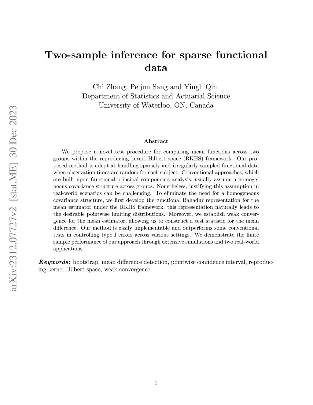 We propose a novel test procedure for comparing mean functions across two groups within the reproducing kernel Hilbert space (RKHS) framework. Our proposed method is adept at handling sparsely and irregularly sampled functional data when observation times are random for each subject. Conventional approaches, that are built upon functional principal components analysis, usually assume homogeneous covariance structure across groups. Nonetheless, justifying this assumption in real-world scenarios can be challenging. To eliminate the need for a homogeneous covariance structure, we first develop the functional Bahadur representation for the mean estimator under the RKHS framework; this representation naturally leads to the desirable pointwise limiting distributions. Moreover, we establish weak convergence for the mean estimator, allowing us to construct a test statistic for the mean difference. Our method is easily implementable and outperforms some conventional tests in controlling type I errors across various settings. We demonstrate the finite sample performance of our approach through extensive simulations and two real-world applications.