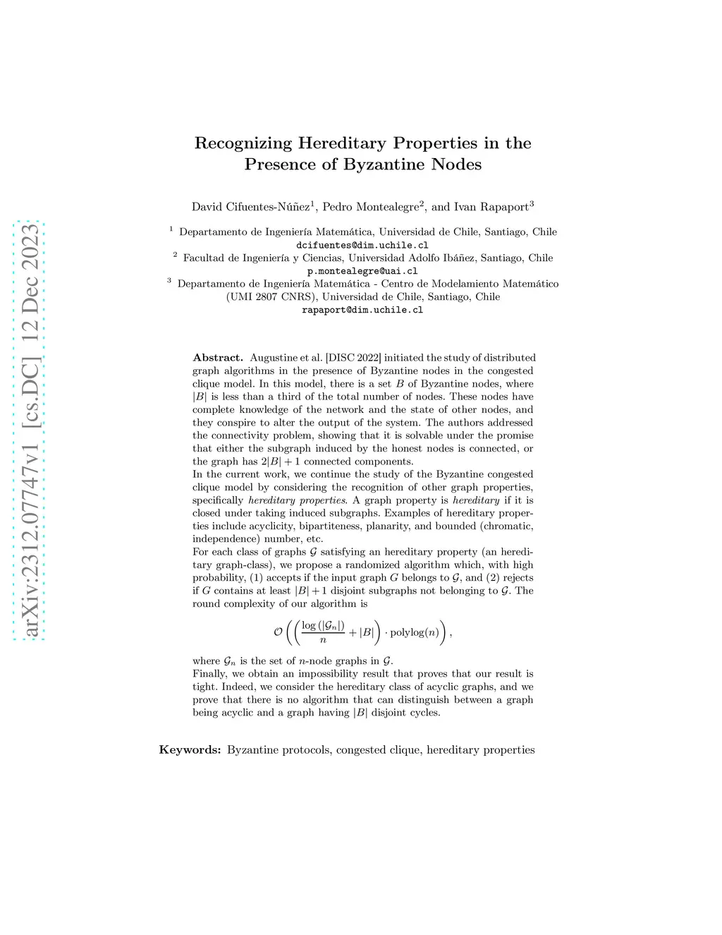 Augustine et al. [DISC 2022] initiated the study of distributed graph algorithms in the presence of Byzantine nodes in the congested clique model. In this model, there is a set of Byzantine nodes, where is less than a third of the total number of nodes. These nodes have complete knowledge of the network and the state of other nodes, and they conspire to alter the output of the system. The authors addressed the connectivity problem, showing that it is solvable under the promise that either the subgraph induced by the honest nodes is connected, or the graph has connected components. In the current work, we continue the study of the Byzantine congested clique model by considering the recognition of other graph properties, specifically \emph{hereditary properties}. A graph property is \emph{hereditary} if it is closed under taking induced subgraphs. Examples of hereditary properties include acyclicity, bipartiteness, planarity, and bounded (chromatic, independence) number, etc. For each class of graphs satisfying an hereditary property (an hereditary graph-class), we propose a randomized algorithm which, with high probability, (1) accepts if the input graph belongs to , and (2) rejects if contains at least disjoint subgraphs not belonging to . The round complexity of our algorithm is where is the set of -node graphs in . Finally, we obtain an impossibility result that proves that our result is tight. Indeed, we consider the hereditary class of acyclic graphs, and we prove that there is no algorithm that can distinguish between a graph being acyclic and a graph having disjoint cycles.
